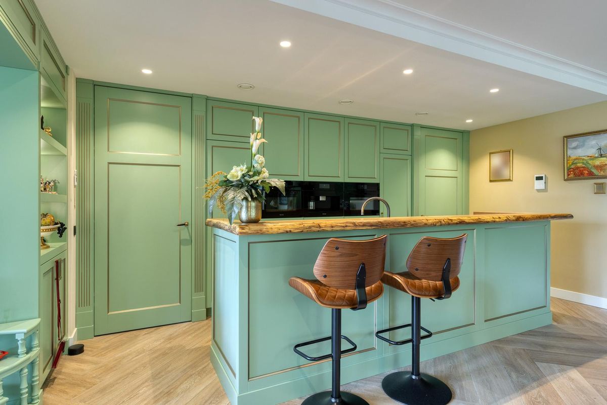 Vanuit de hal is de riante living met open keuken bereikbaar. De open indeling verbindt de op maat gemaakte keuken en eetkamer moeiteloos met de gezellige zitkamer. De volledig op maat ontworpen keuken vormt het hart van het appartement. Hoogwaardige materialen, een strakke afwerking en slimme indelingen zorgen voor comfort tijdens het bereiden van een heerlijke maaltijd. Het kook- en spoeleiland is afgewerkt met een hoogwaardig marmeren werkblad. Hier vindt u niet alleen een moderne inductiekookplaat, maar ook een geïntegreerd spoelgedeelte met Quooker-kraan (met heet, koud en bruisend water) en een ingebouwde Miele vaatwasser. Langs de wand is een op maat gemaakte en praktisch ingerichte kastenwand gerealiseerd. Deze biedt niet alleen veel opbergruimte, maar is ook uitgerust met luxe inbouwapparatuur van Miele, waaronder een stoomoven, combi-magnetron, koffiemachine, een grote koelkast en een aparte vriezer. Alles is perfect geïntegreerd, waardoor de keuken rust en overzicht uitstraalt. De leefruimte wordt deels gescheiden door de kastenwand langs het plafond en de wanden waardoor een gezellige zitkamer ontstaat. De kast is ontworpen om ruimte te benutten én te creëren. Geen loze hoeken, geen rommelige oplossingen, maar doordachte opbergmogelijkheden die bijdragen aan een opgeruimde en harmonieuze leefomgeving. Het ruime balkon is zowel vanuit de eetkamer als ook vanuit de zitkamer te bereiken.