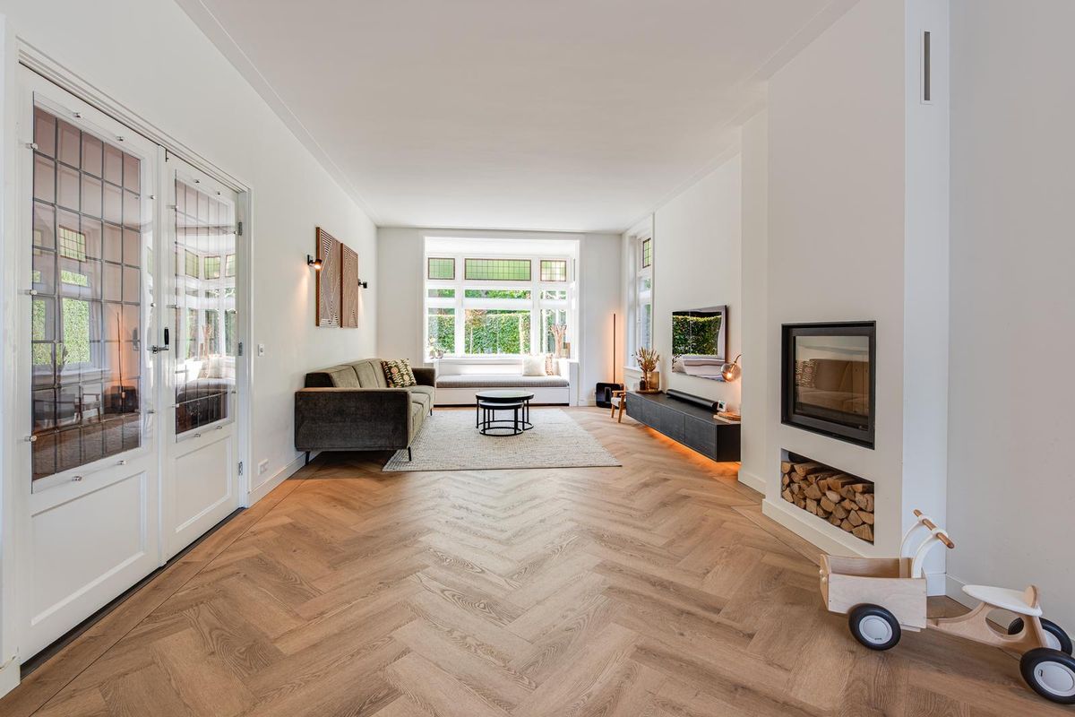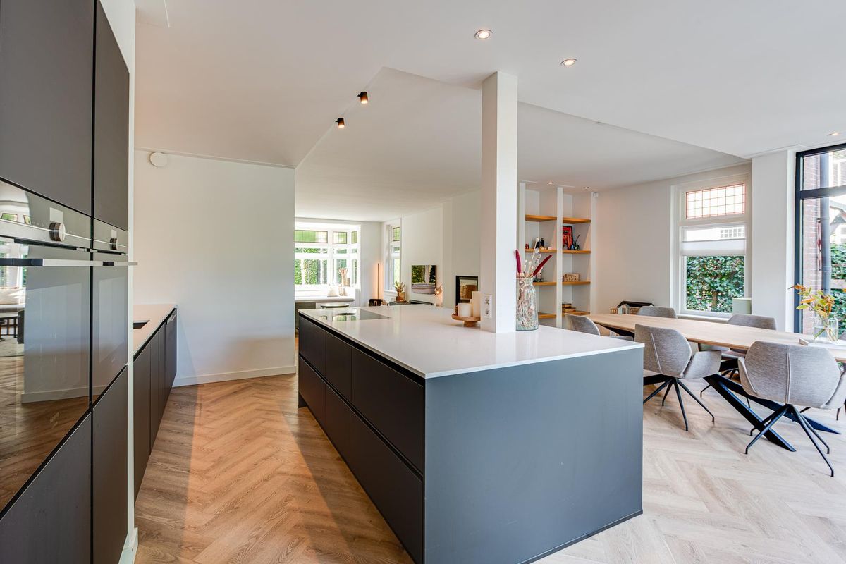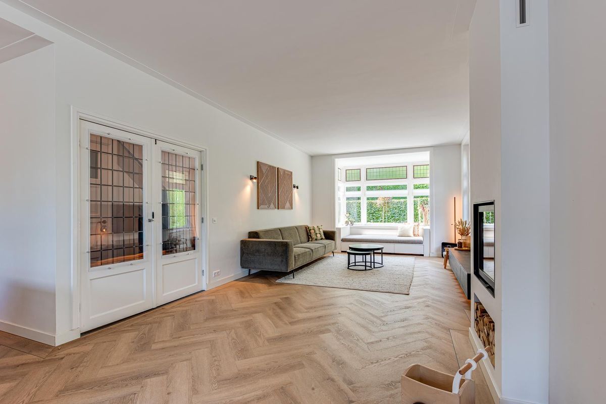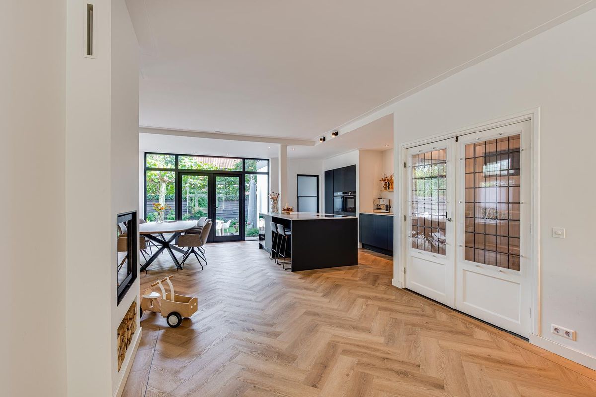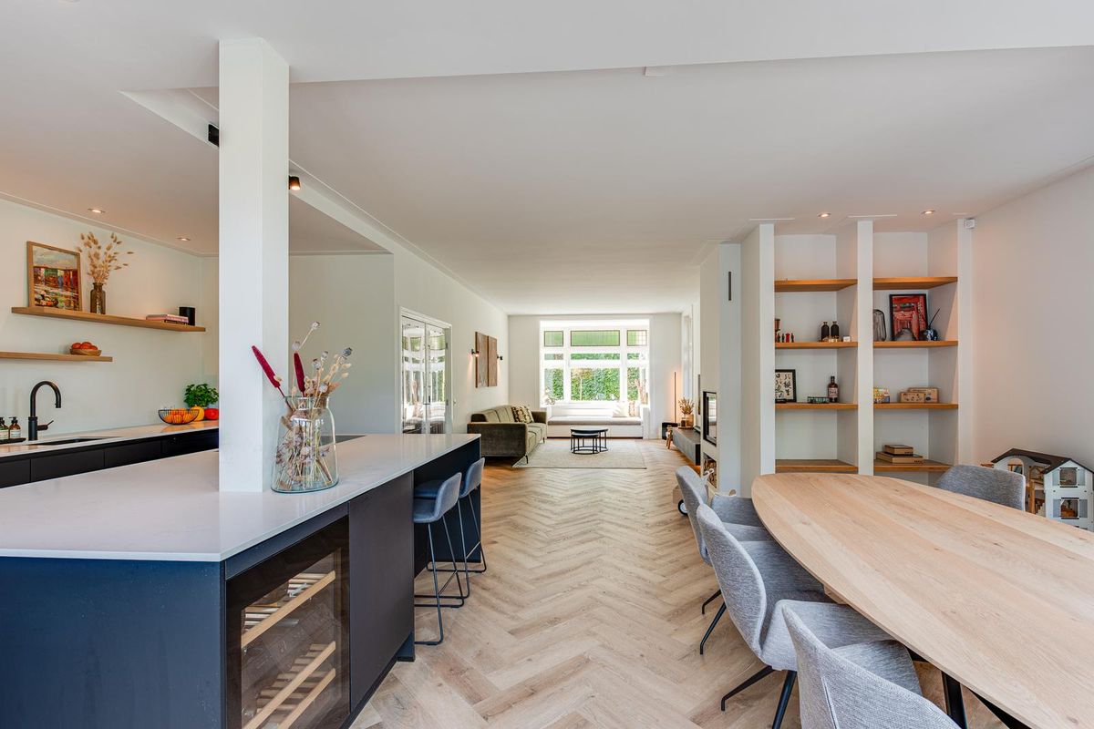 De entreehal met originele granito vloer geeft karakter aan de woning. Hier vind je de garderobe, het toilet en de meterkast. Via stijlvolle en-suite deuren met glas-in-lood bereik je de sfeervolle woonkamer met erker aan de voorzijde, open haard en dubbele openslaande tuindeuren aan de achterzijde. De PVC-vloer met vloerverwarming zorgt voor comfort en een strakke uitstraling. De royale, in 2021 vernieuwde open keuken is fors uitgebouwd en voorzien van een kookeiland, luxe Siemens iQ700 inbouw apparatuur waaronder een BORA x PURE inbouw inductie kookplaat, een wijnklimaatkast en een Quooker combi flex kraan. Aansluitend is de geheel vernieuwde bijkeuken met veel kastruimte, de wasmachine en de droger, een close in boiler en de deur naar het terras bij de achtertuin.