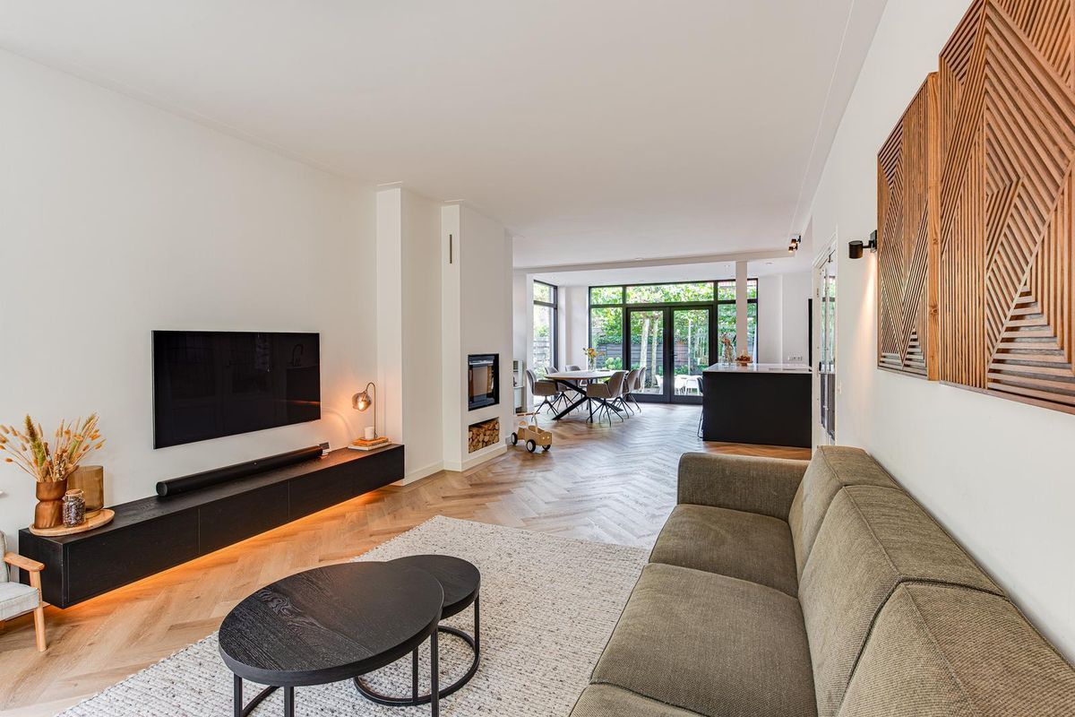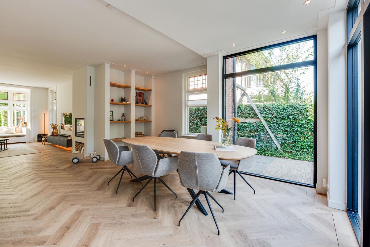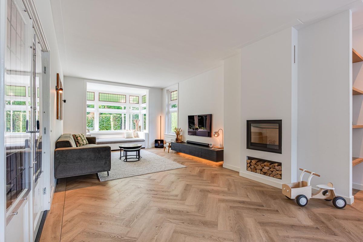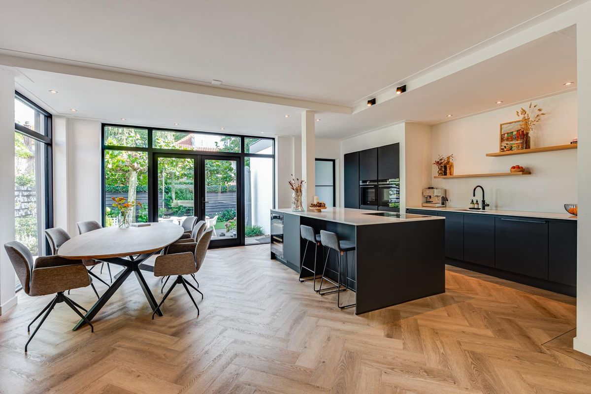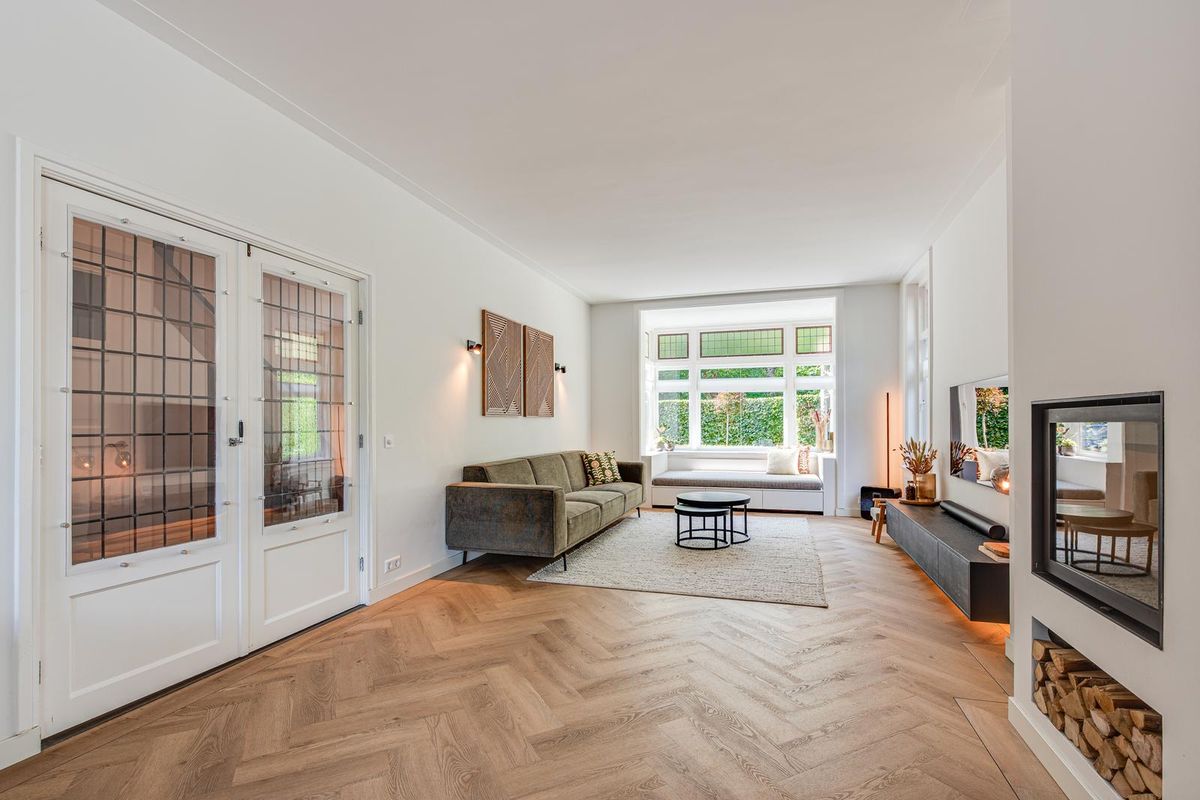 De entreehal met originele granito vloer geeft karakter aan de woning. Hier vind je de garderobe, het toilet en de meterkast. Via stijlvolle en-suite deuren met glas-in-lood bereik je de sfeervolle woonkamer met erker aan de voorzijde, open haard en dubbele openslaande tuindeuren aan de achterzijde. De PVC-vloer met vloerverwarming zorgt voor comfort en een strakke uitstraling. De royale, in 2021 vernieuwde open keuken is fors uitgebouwd en voorzien van een kookeiland, luxe Siemens iQ700 inbouw apparatuur waaronder een BORA x PURE inbouw inductie kookplaat, een wijnklimaatkast en een Quooker combi flex kraan. Aansluitend is de geheel vernieuwde bijkeuken met veel kastruimte, de wasmachine en de droger, een close in boiler en de deur naar het terras bij de achtertuin.