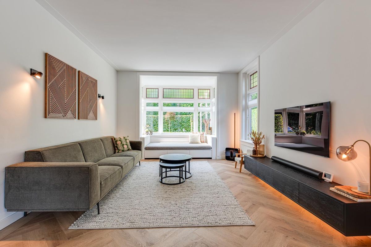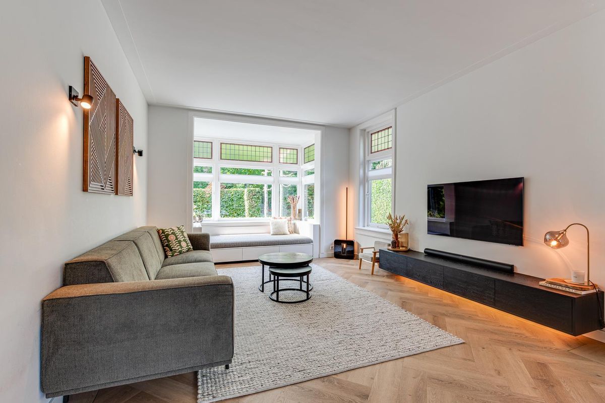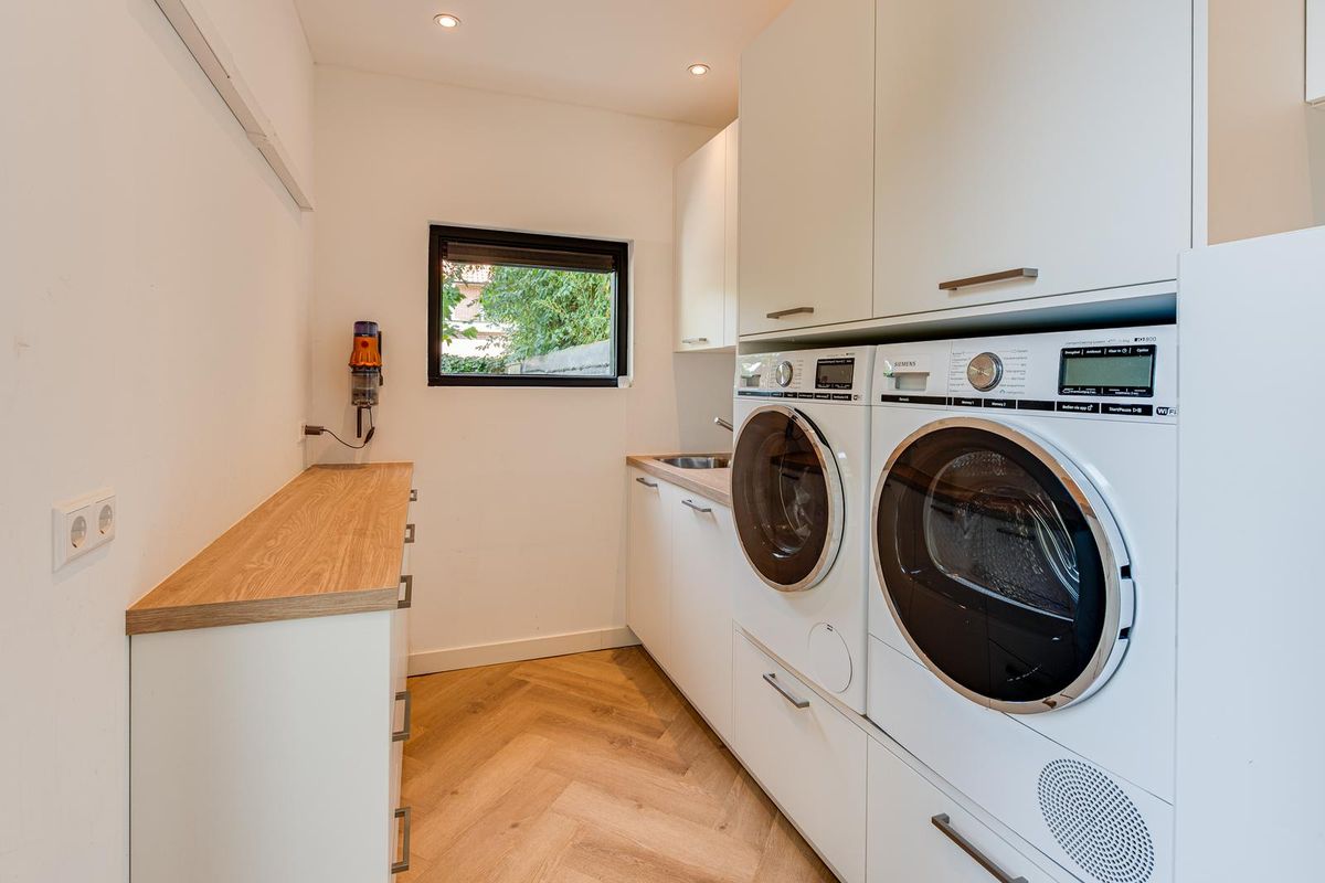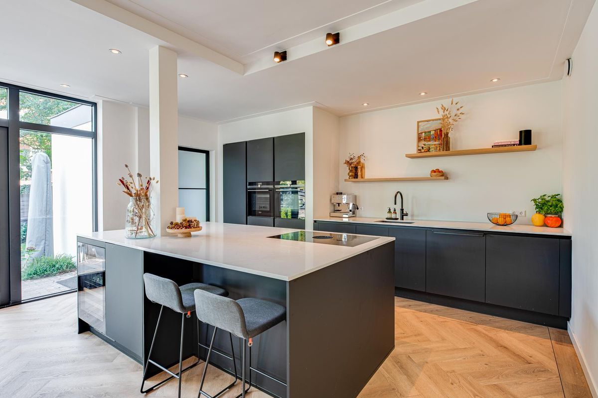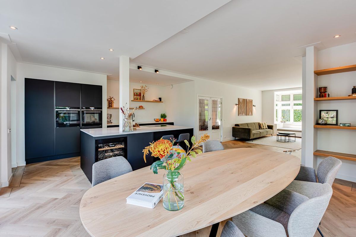 De entreehal met originele granito vloer geeft karakter aan de woning. Hier vind je de garderobe, het toilet en de meterkast. Via stijlvolle en-suite deuren met glas-in-lood bereik je de sfeervolle woonkamer met erker aan de voorzijde, open haard en dubbele openslaande tuindeuren aan de achterzijde. De PVC-vloer met vloerverwarming zorgt voor comfort en een strakke uitstraling. De royale, in 2021 vernieuwde open keuken is fors uitgebouwd en voorzien van een kookeiland, luxe Siemens iQ700 inbouw apparatuur waaronder een BORA x PURE inbouw inductie kookplaat, een wijnklimaatkast en een Quooker combi flex kraan. Aansluitend is de geheel vernieuwde bijkeuken met veel kastruimte, de wasmachine en de droger, een close in boiler en de deur naar het terras bij de achtertuin.