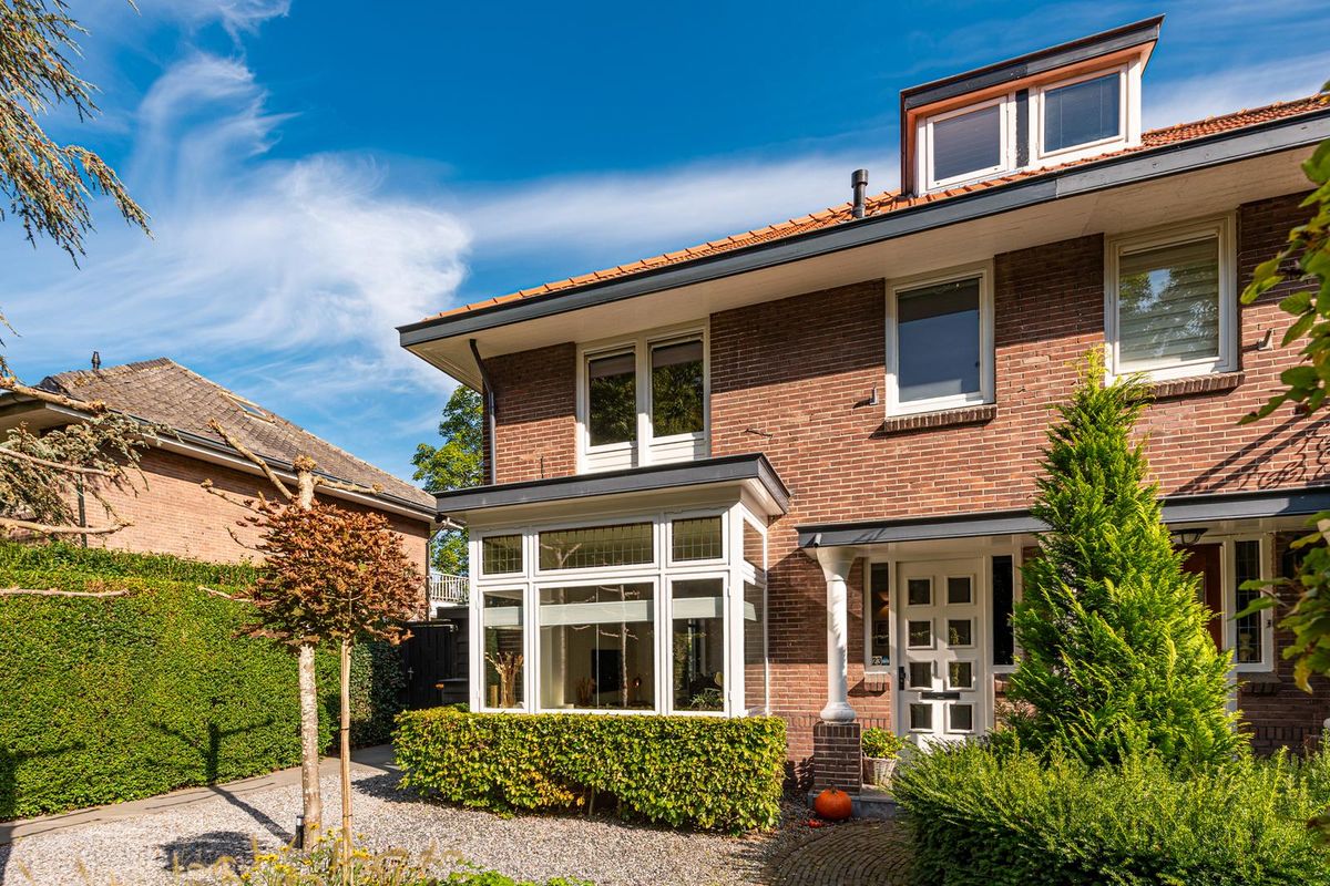 De voortuin is fraai aangelegd met beukenhagen, klinkerpaden en grind en in de achtertuin geniet je in alle privacy op verschillende terrassen van de zon of de schaduw. Er zijn twee dakplatanen, fruitbomen en mooie borders met bloemen en planten.