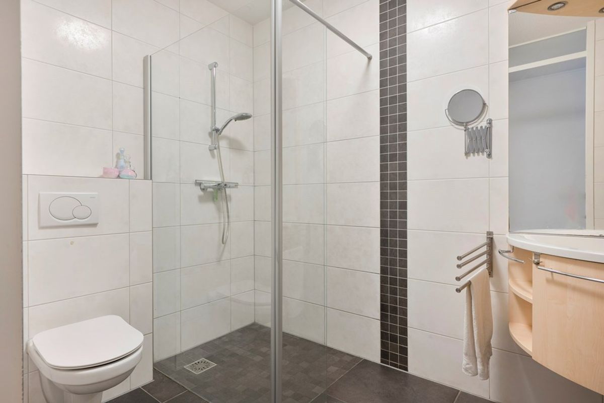Badkamer voorzien van een wastafel met opbergmeubel, inloopdouche en toilet.