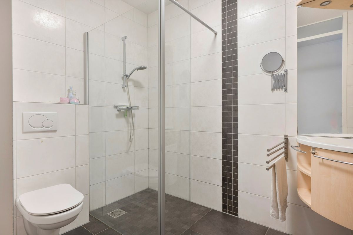 Badkamer voorzien van een wastafel met opbergmeubel, inloopdouche en toilet.