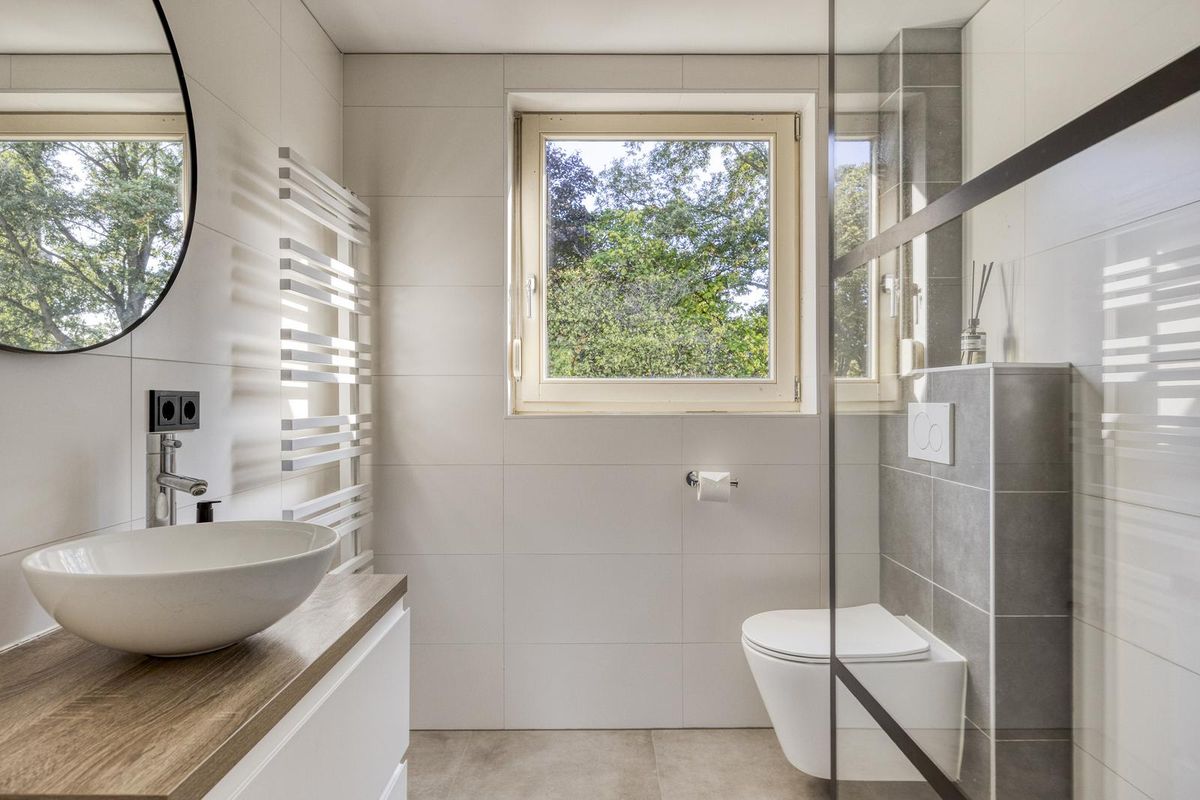 De badkamer (2021) is een plaatje: met moderne tegels, een badkamermeubel, inloopdouche met regendouche en handdouche, designradiator en een zwevend toilet. Hier begin je je dag fris en luxe.