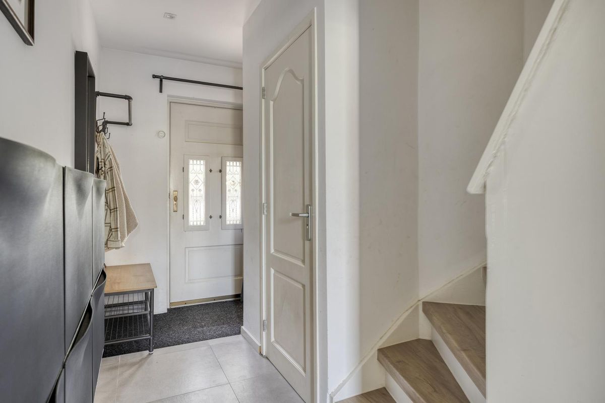 De netjes aangelegde voortuin leidt je naar de voordeur. Binnen stap je in een ruime hal met de meterkast (acht groepen, twee aardlekschakelaars en een aparte groep voor de zonnepanelen), het toilet, de trapopgang en de deur naar de keuken. De lichtgrijze tegelvloer loopt stijlvol door over de hele begane grond.
