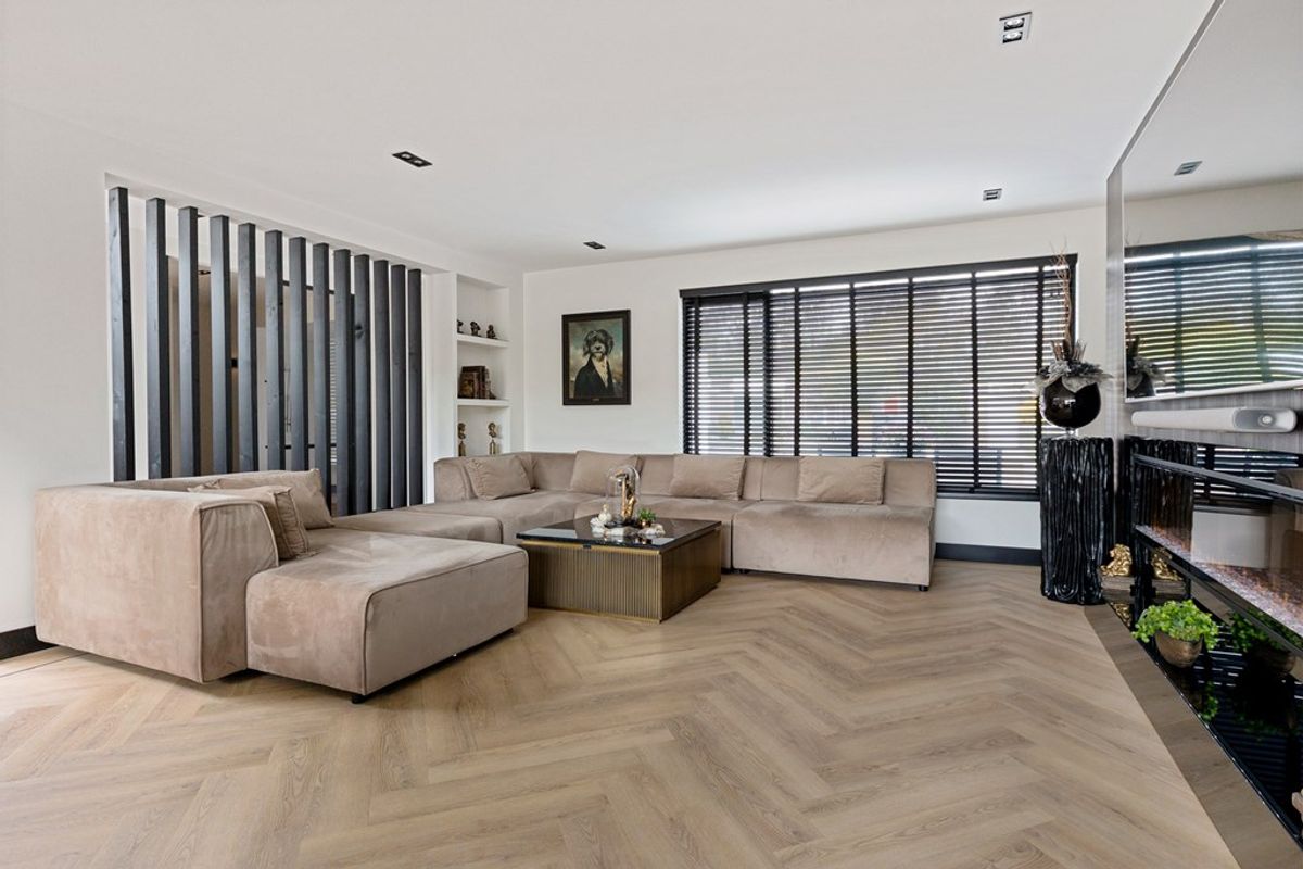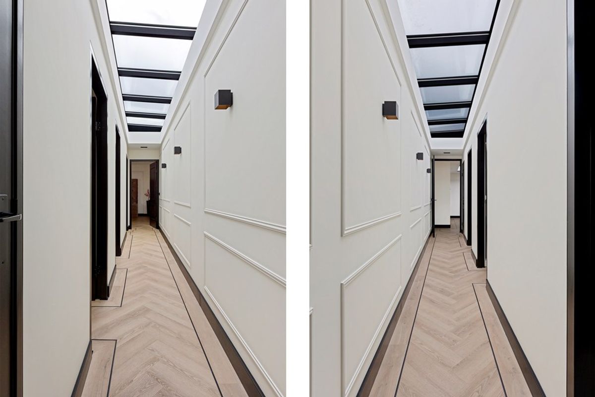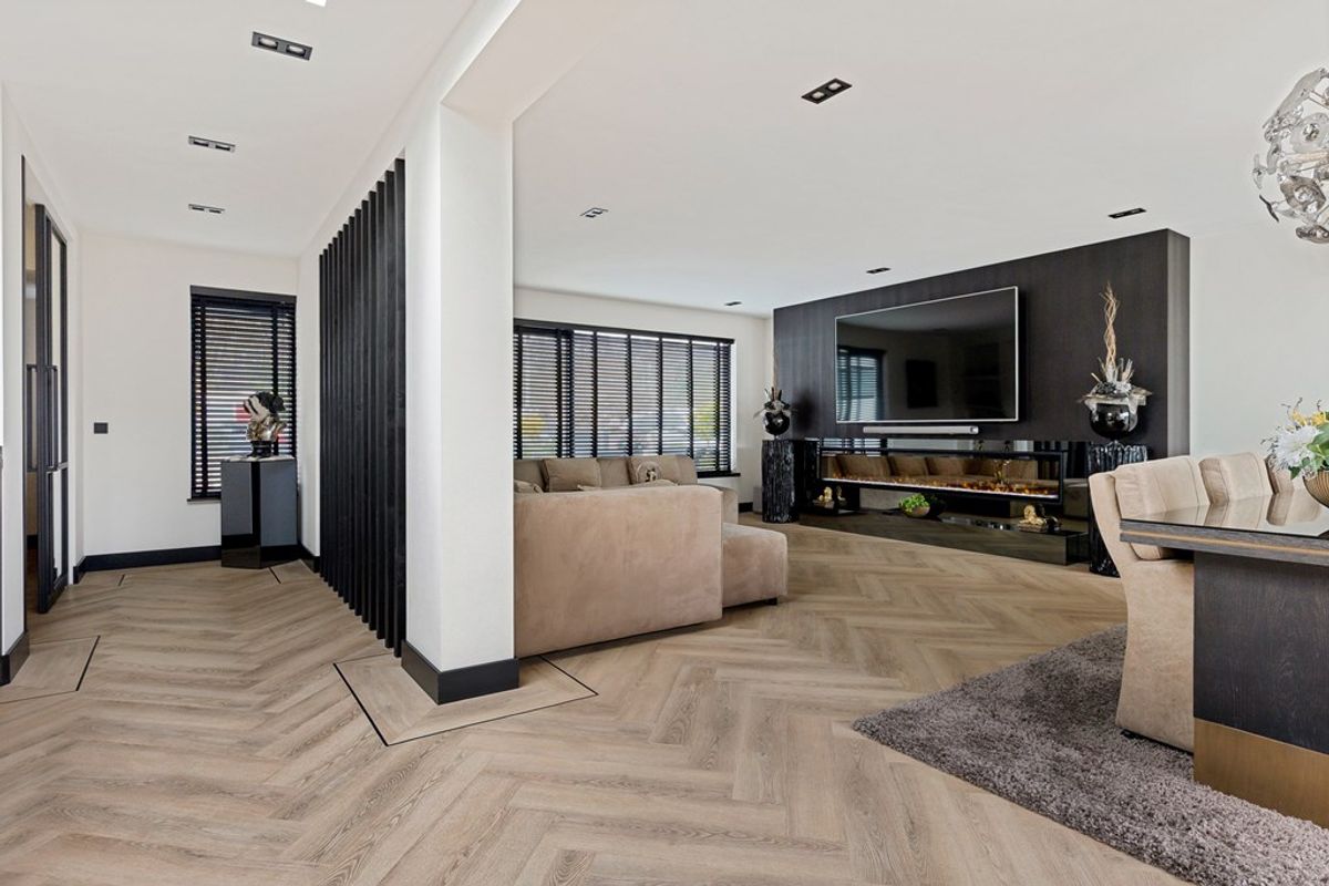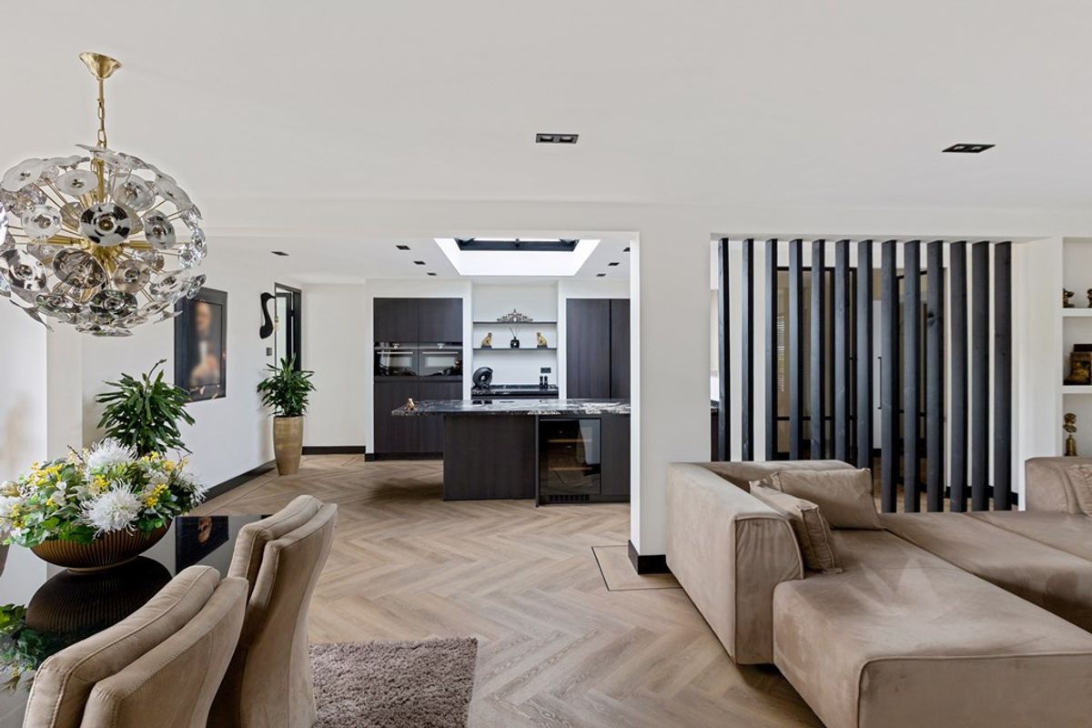 De woonkamer is ruim opgezet en kenmerkt zich door de grote raampartijen en luxe lichtstraten in het dak, die zorgen voor een prettige lichtinval. De ruimte is voorzien van strak afgewerkte wanden en biedt volop mogelijkheden voor het creëren van een comfortabele zithoek en een ruime eethoek. De woonkamer beschikt over een airco instalatie