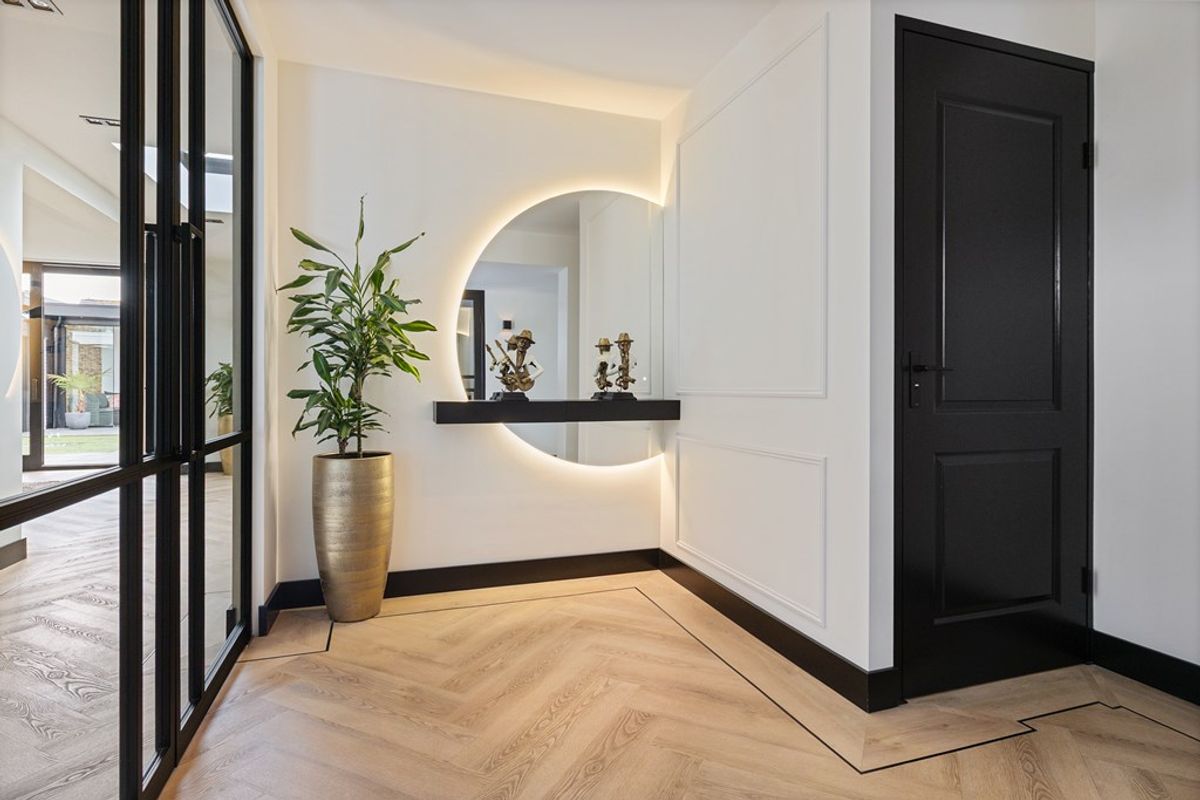 Upon entering through the front door, you’ll immediately notice the high-quality finish. The entrance hall provides access to a separate toilet with a small sink, as well as the indoor garage, which houses the upgraded electrical panel and inverter. From here, two pivot doors lead you into the living room.