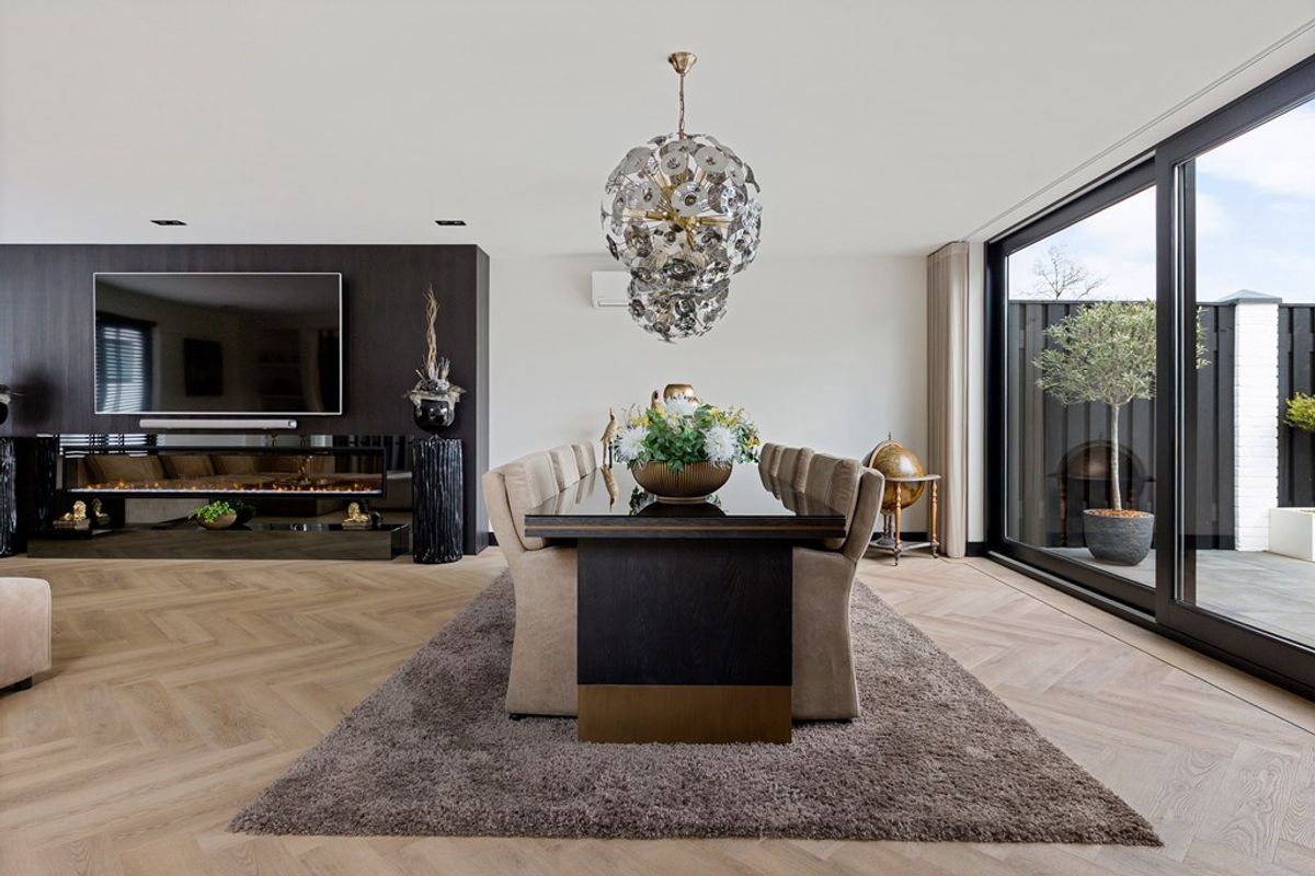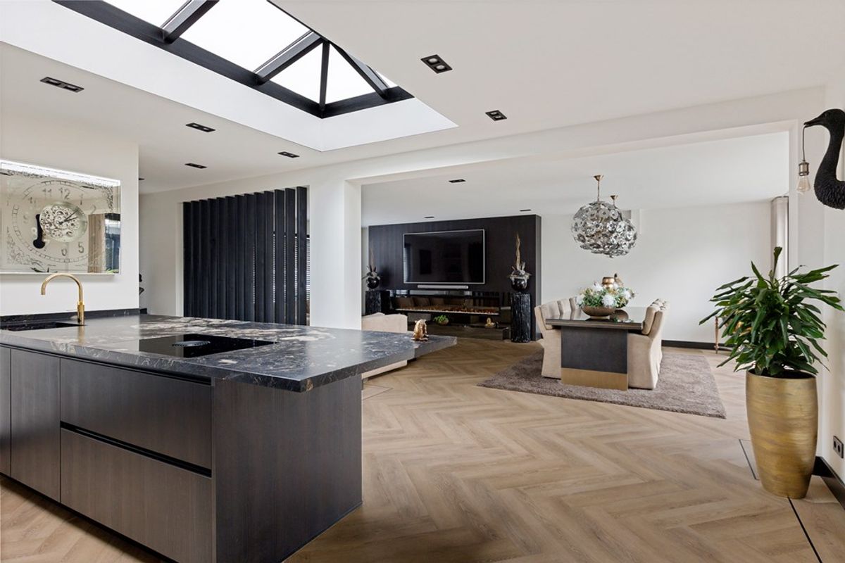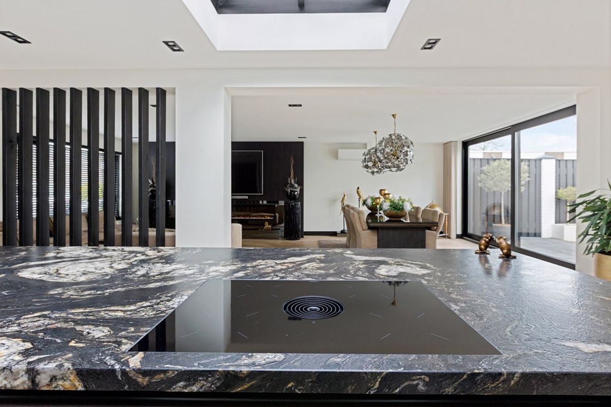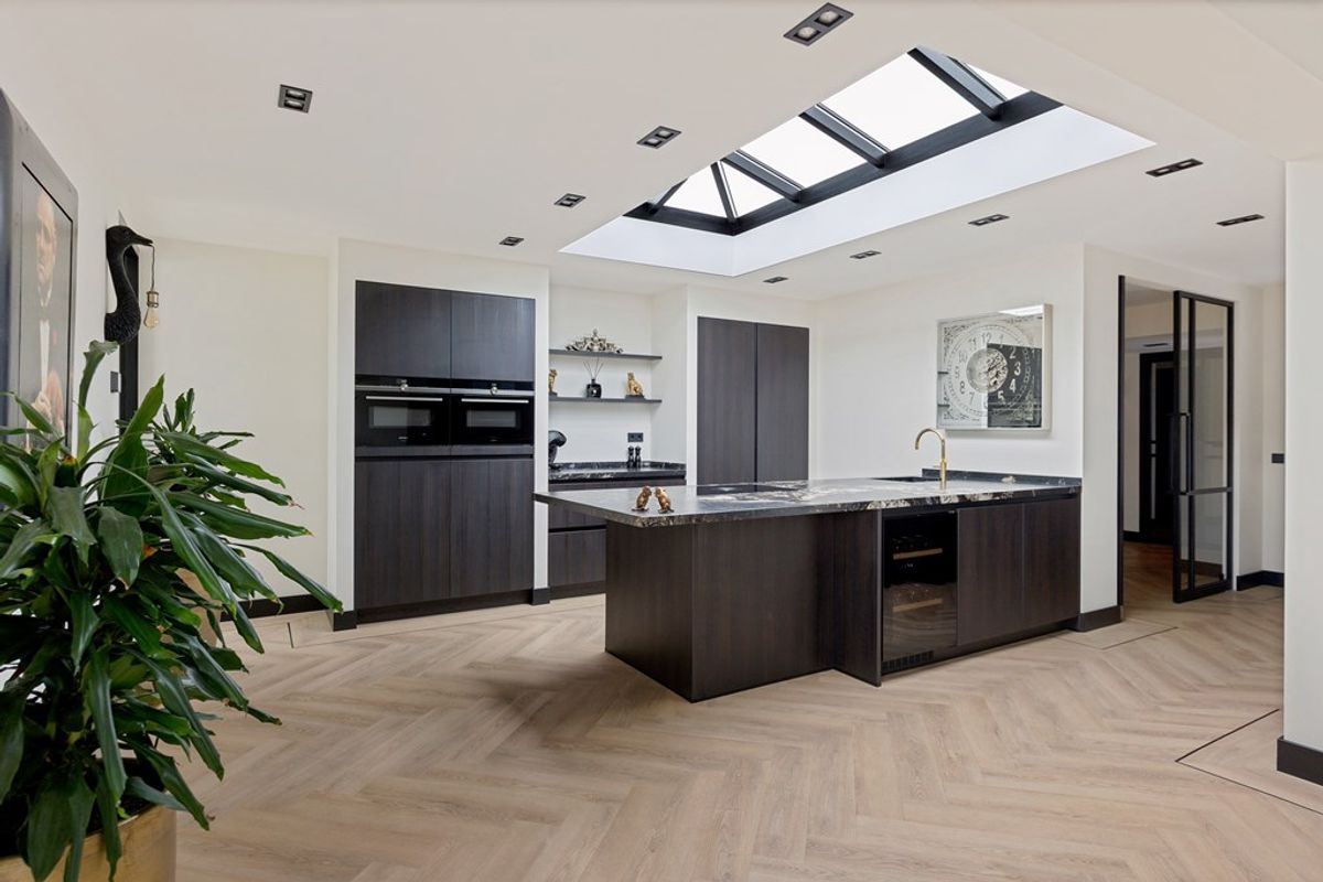 At the rear of the living room, you’ll find the kitchen. The kitchen stands out due to its cabinetry and natural stone countertop and is fitted with high-end appliances, including: a cooktop with an integrated extraction system, two combination ovens, a sink with a Quooker tap, dishwasher, fridge and freezer, and a built-in wine climate cabinet.