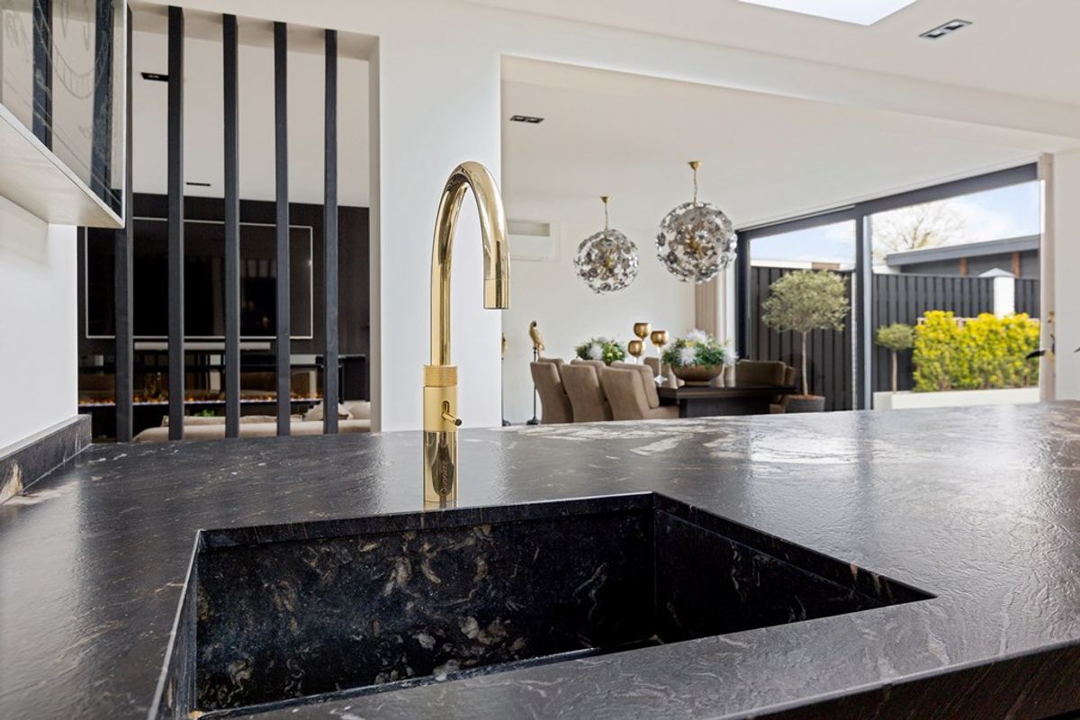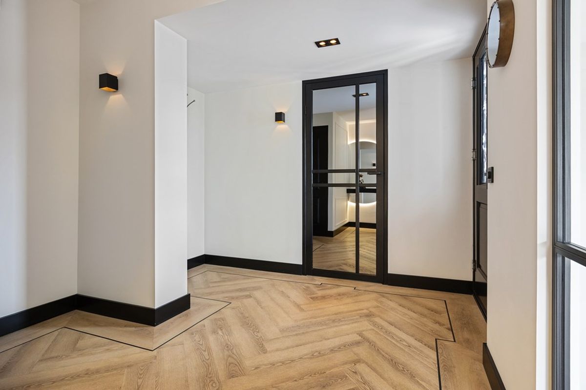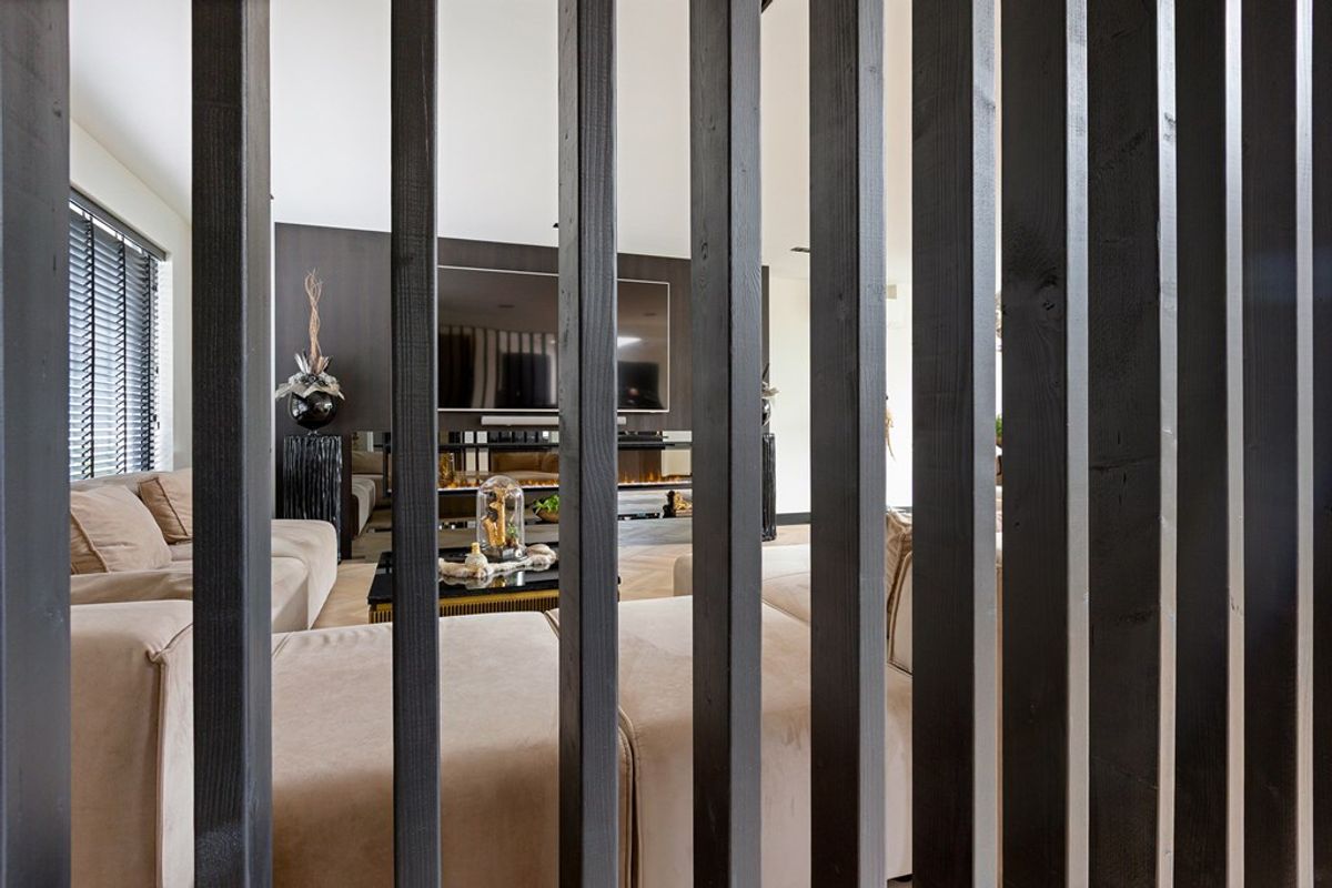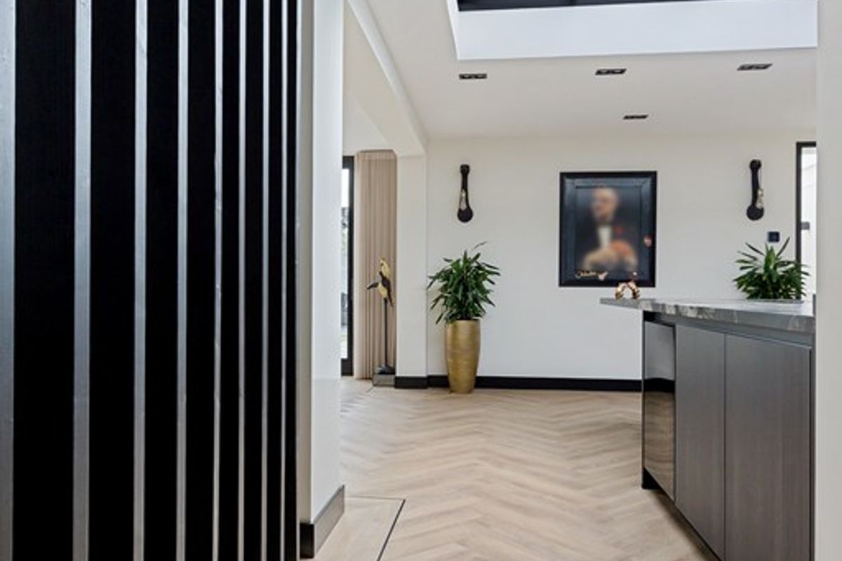 At the rear of the living room, you’ll find the kitchen. The kitchen stands out due to its cabinetry and natural stone countertop and is fitted with high-end appliances, including: a cooktop with an integrated extraction system, two combination ovens, a sink with a Quooker tap, dishwasher, fridge and freezer, and a built-in wine climate cabinet.