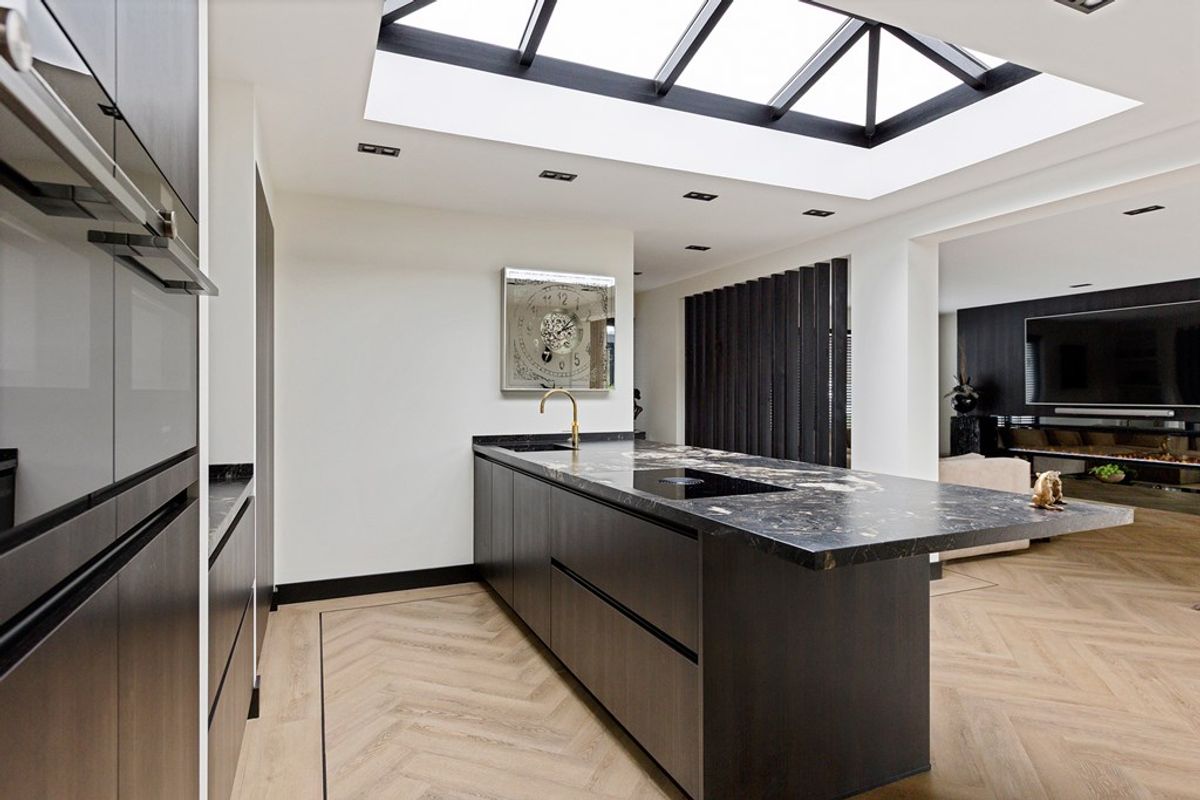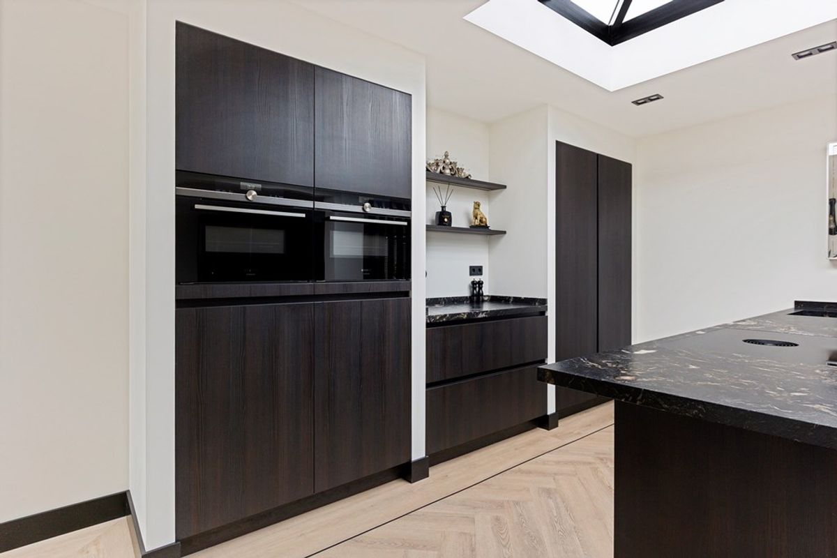 Aan de achterzijde van de woonkamer is de keuken gelegen. De keuken kenmerkt zich door de keukenkastjes en het natuurstenen werkblad en is zeer luxe ingericht. U beschikt hier over de volgende apparatuur: kookplaat met geïntrigeerde afzuigsysteem, 2x combi oven een spoelbak met Quooker kraan, vaatwasser, koel en vrieskast en een ingebouwde wijnklimaatkast.