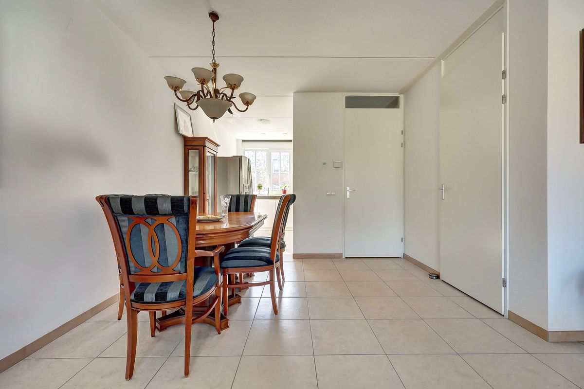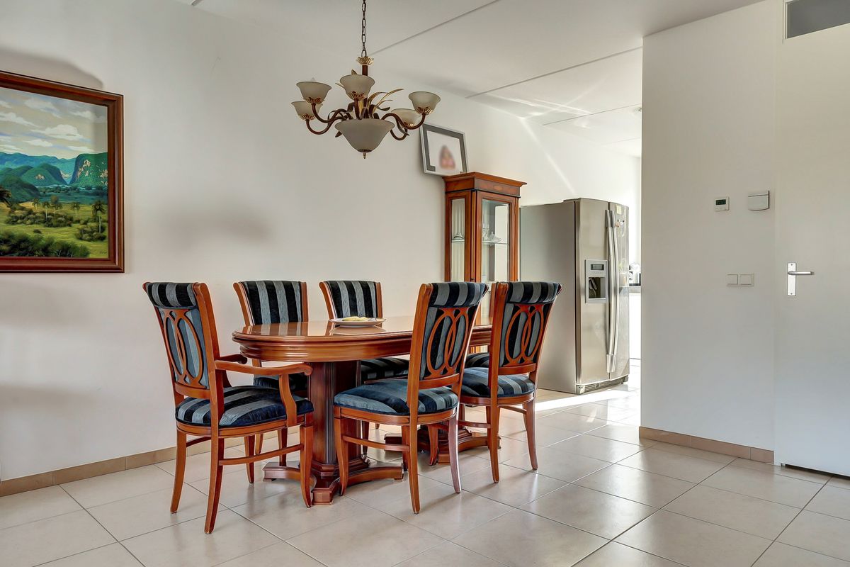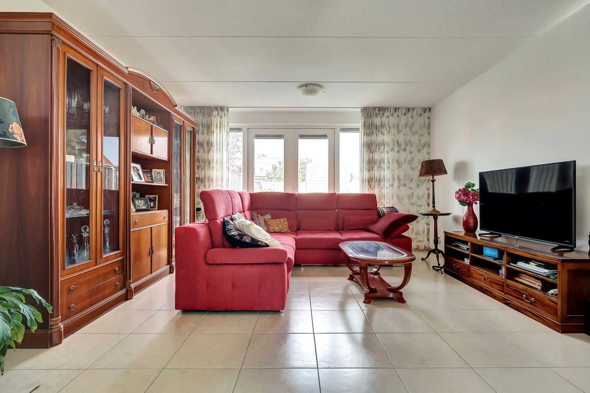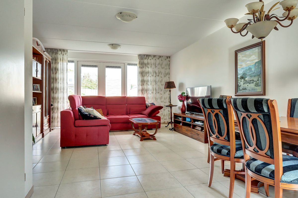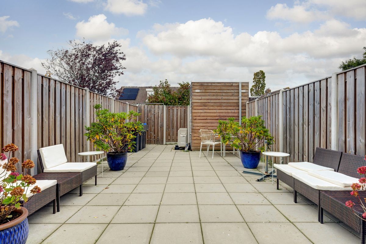 Vanuit de woonkamer stapt u zo door de dubbel openslaande deuren de ruime tuin in waar zich een stenen berging met vaste vloer bevindt. Uiteraard is er een achterom.