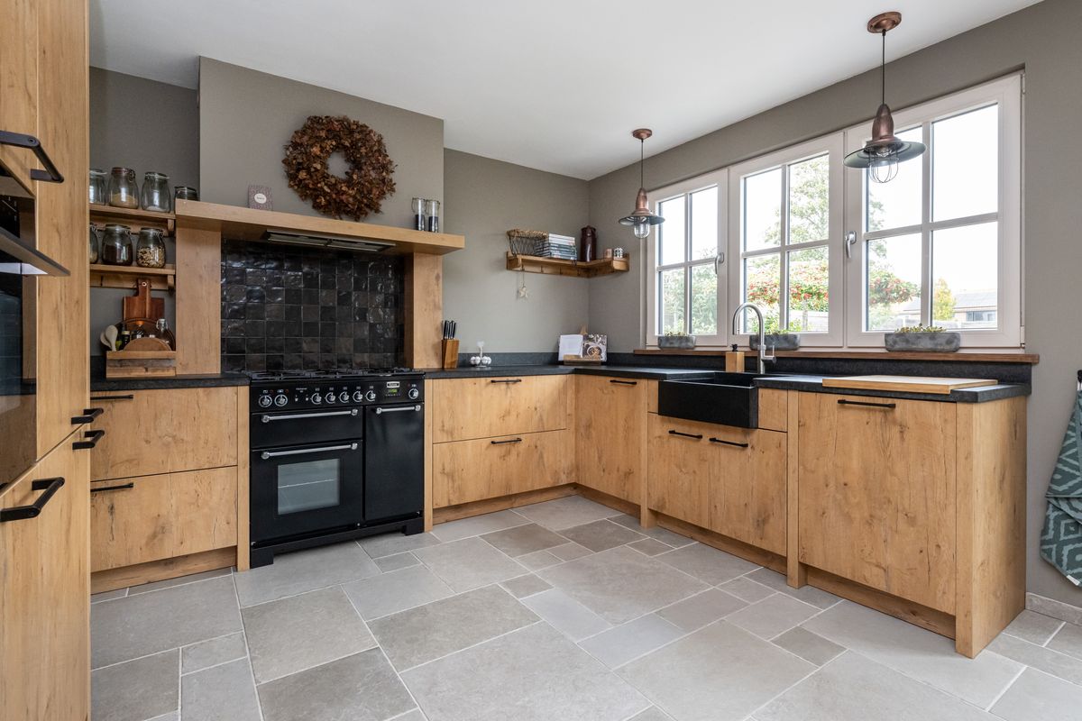 Aan de achterzijde van de woning bevindt zich de prachtige aanbouw uit 2021, waar een luxe woonkeuken is gerealiseerd die het hart van het huis vormt. Hier komt koken, gezelligheid en stijl samen. De keuken is uitgerust met een Quooker, enkele spoelbak, vaatwasser, combi-magnetron, een indrukwekkend Falcon vijfpits gasfornuis met twee ovens en grill, een afzuigkap, koelkast, vriezer en een composiet werkblad. De dubbel openslaande deuren geven direct toegang tot de tuin en zorgen voor een heerlijke verbinding tussen binnen en buiten – ideaal voor lange zomeravonden of een gezellig diner met familie en vrienden.