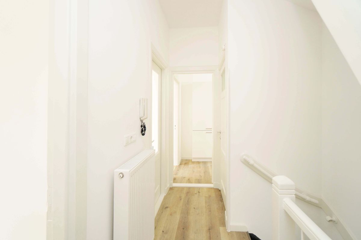 Via de trap in de hal bereik je de bovenverdieping, waar zich twee slaapkamers bevinden. Daarnaast is er een studeerkamer/kastenkamer aanwezig. De badkamer op deze etage is uitgerust met een inloopdouche en een wastafelmeubel met wastafel en spiegel.