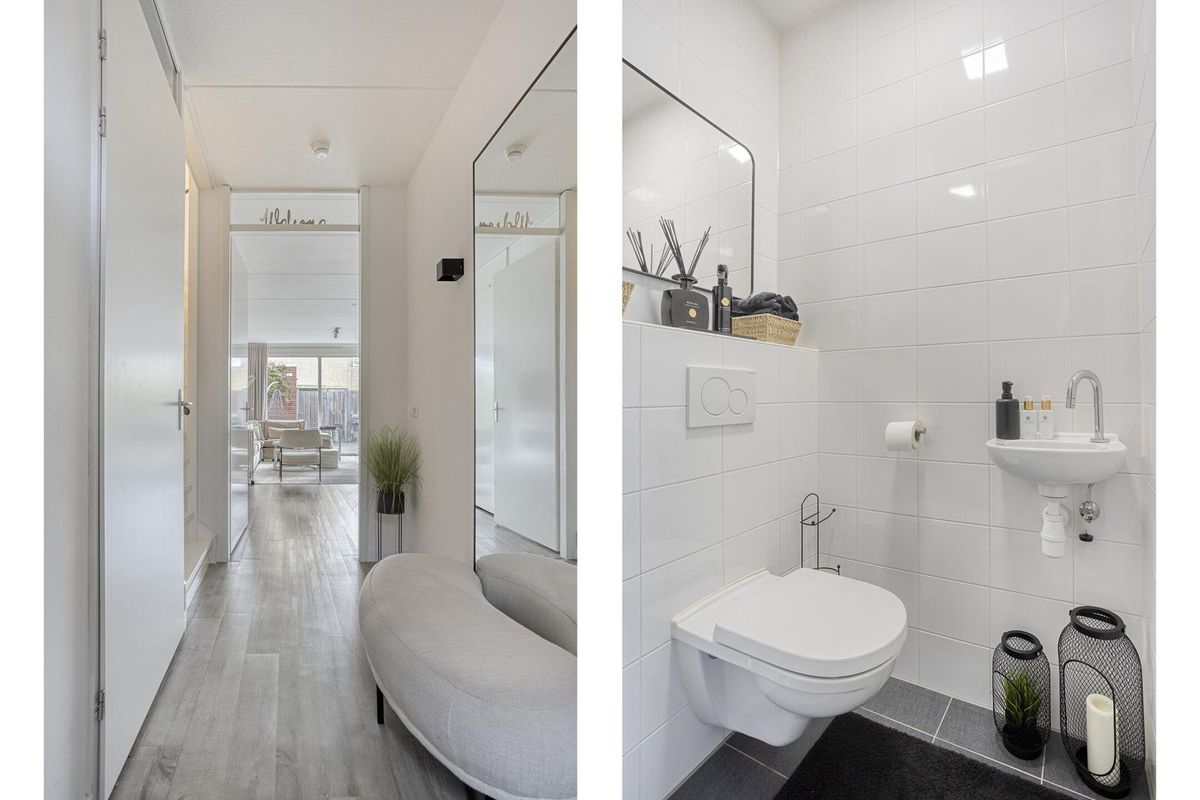 Entree met hal, meterkast, modern toilet, trapopgang naar de eerste verdieping en toegang tot de woonkamer.