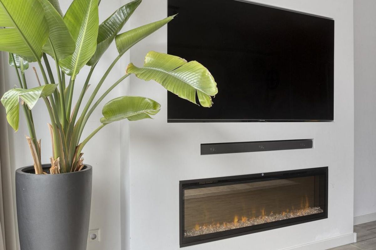 De ruime woonkamer met royale uitbouw is voorzien van een moderne PVC-vloer met vloerverwarming en een stijlvolle cinemawall met sfeervolle elektrische haard.