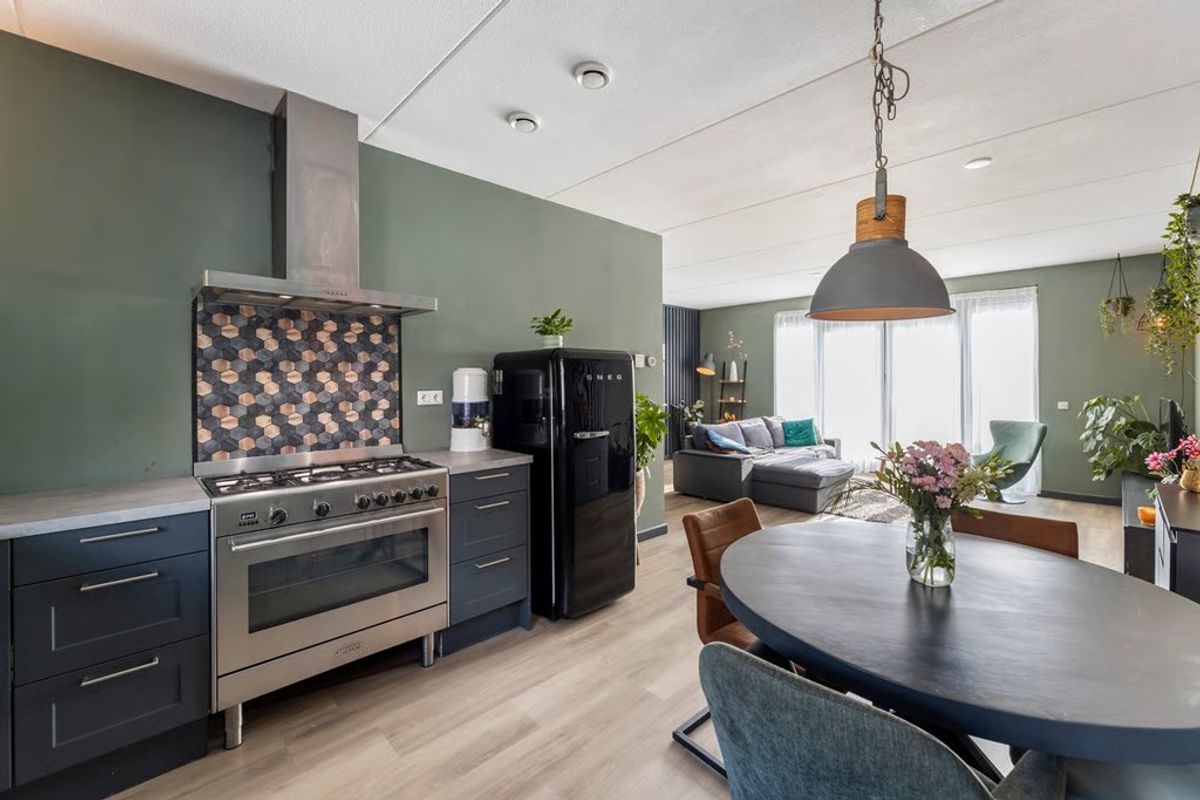 De halfopen keuken is uitgerust met alle benodigde inbouwapparatuur zoals een gasfornuis, afzuigkap, combi-oven, koel-vriescombinatie en een vaatwasser.