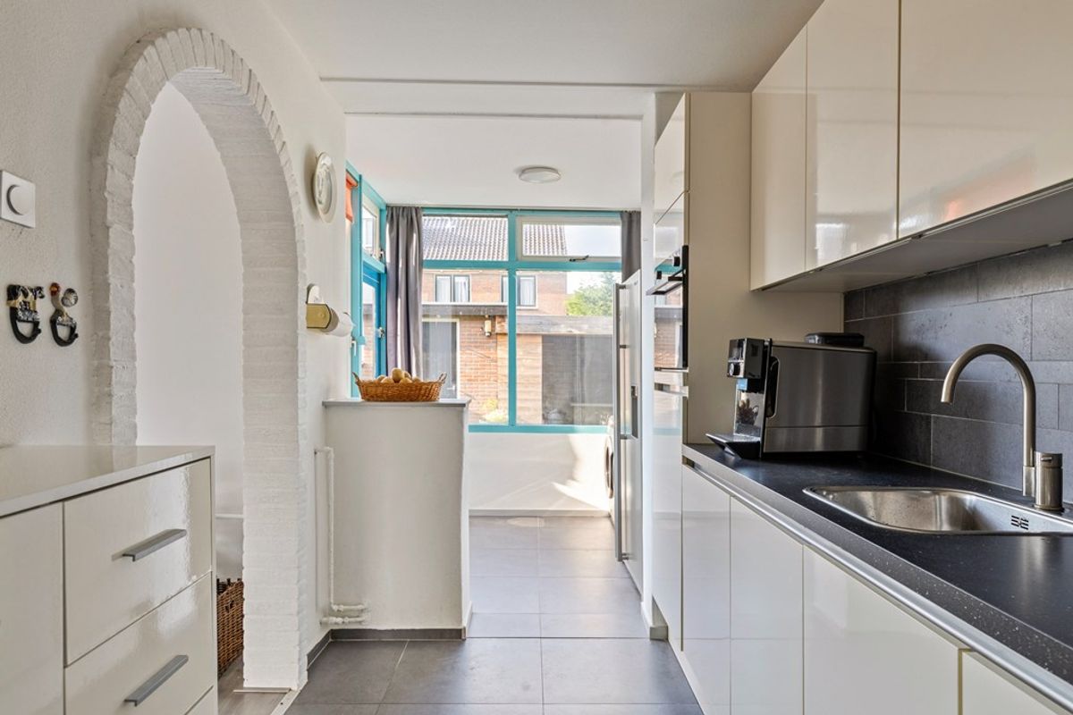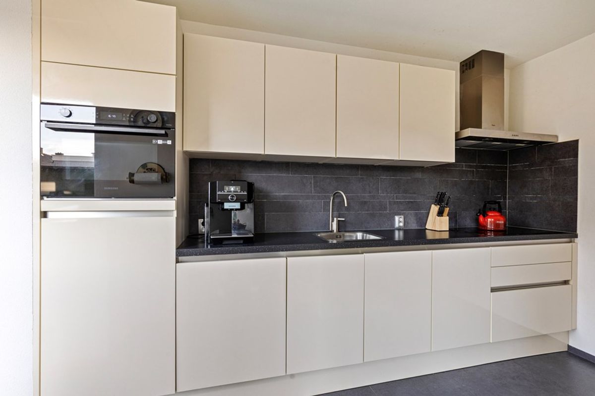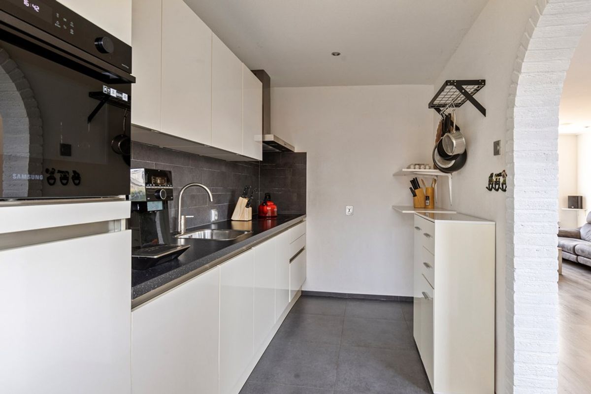 Via de ronde toog loopt u de keuken in, die vanwege de gedeeltelijke tussenwand veel ruimte biedt. Grappig detail is het stalraampje tussen de woonkamer en keuken in. Nette, moderne keuken in een rechte opstelling met kunststof werkblad. Inbouwapparatuur: inductie kookplaat (2015), afzuigkap en een combi oven-magnetron (2023). De losse koelvries-combinatie blijft voor u achter. Op de vloer ligt een praktische donkergrijze tegel.