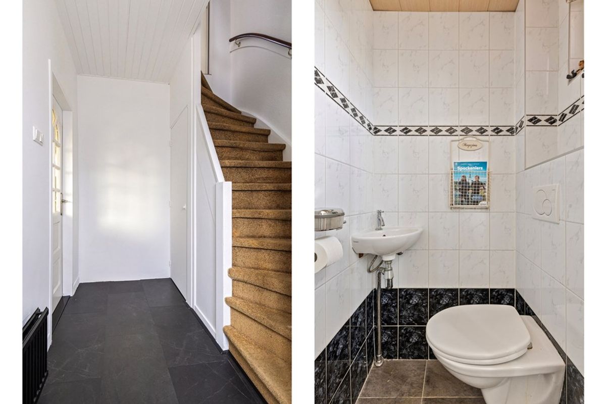 Ruime hal met deuren naar de toiletruimte (met wandcloset), meterkast (vernieuwd en glasvezelaansluiting), trapkast en woonkamer. In de hal bevindt zich ook de trap naar boven. Fijn is ook de kunststof voordeur met driepunts veiligheidssluiting