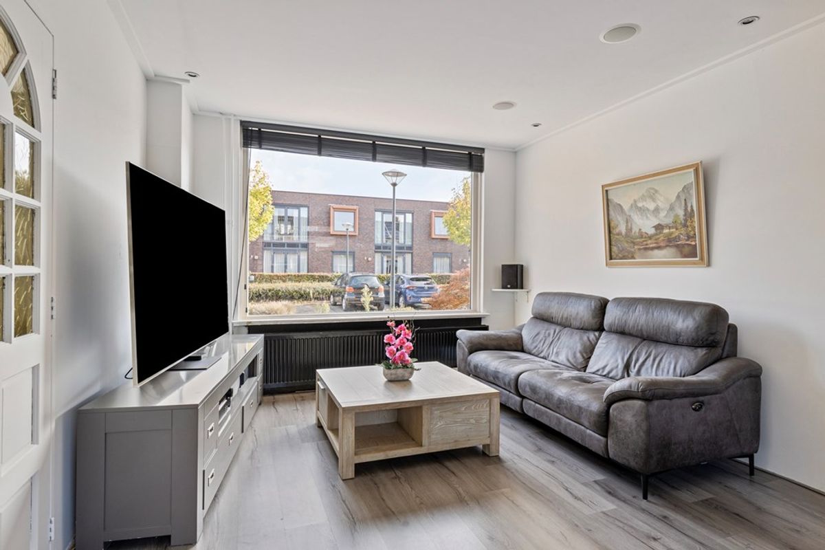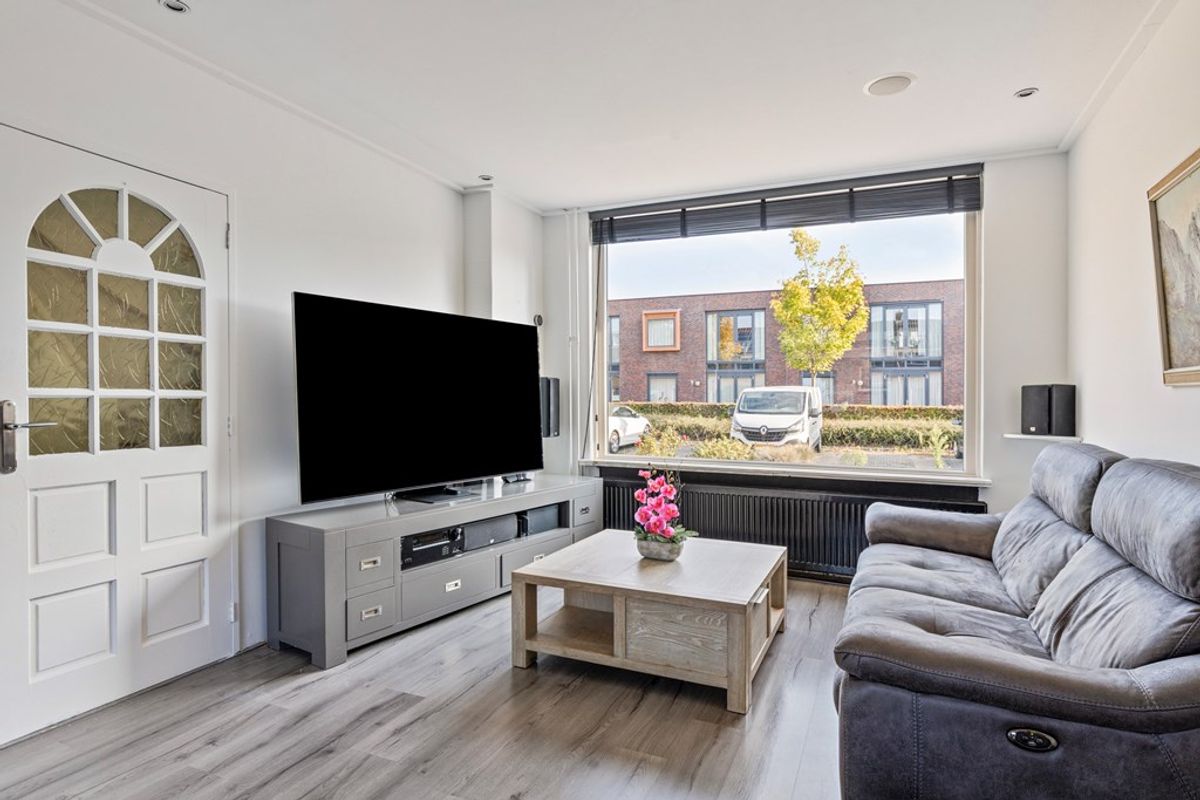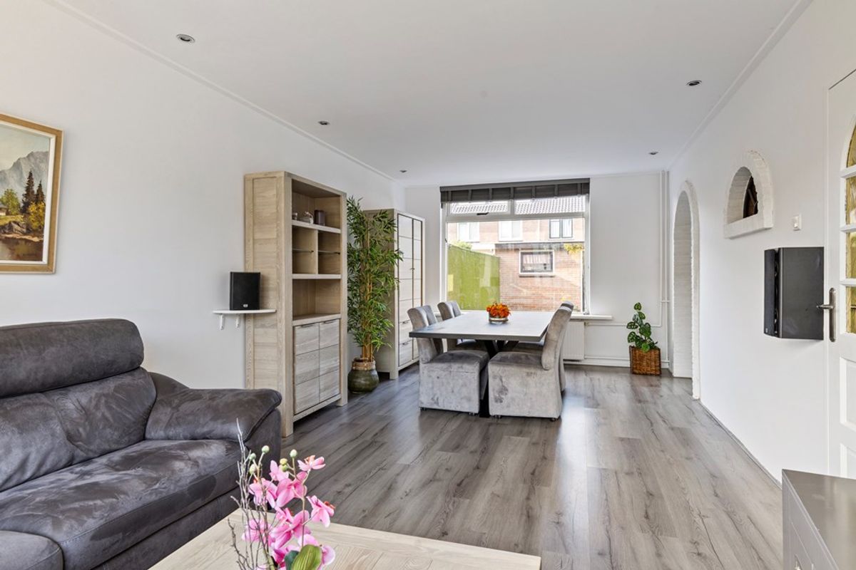 Fijne living met in de ochtend en deel middag de zon aan de voorzijde, en een deel van de middag en avond de zon aan de achterzijde. Wanden en plafond zijn glad gestuct, op de vloer ligt een laminaatplank.