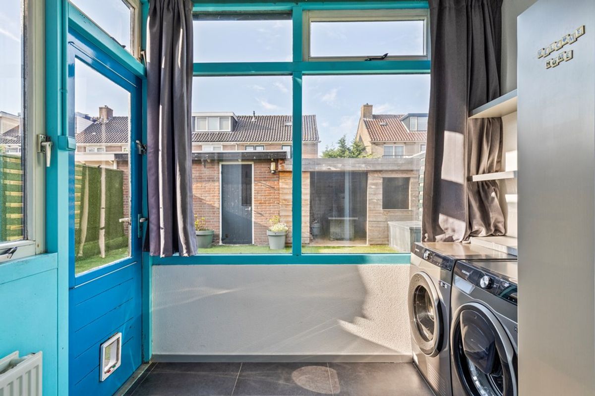 Ideaal voor de rest van de witgoedopstelling. De koelvries-combi staat hier en daarnaast zijn de aansluitingen voor wasmachine en droger. Via de loopdeur loopt u de achtertuin in.