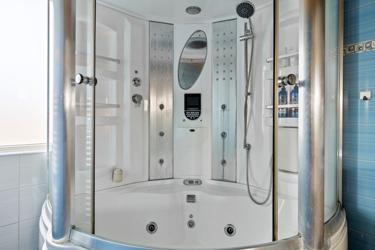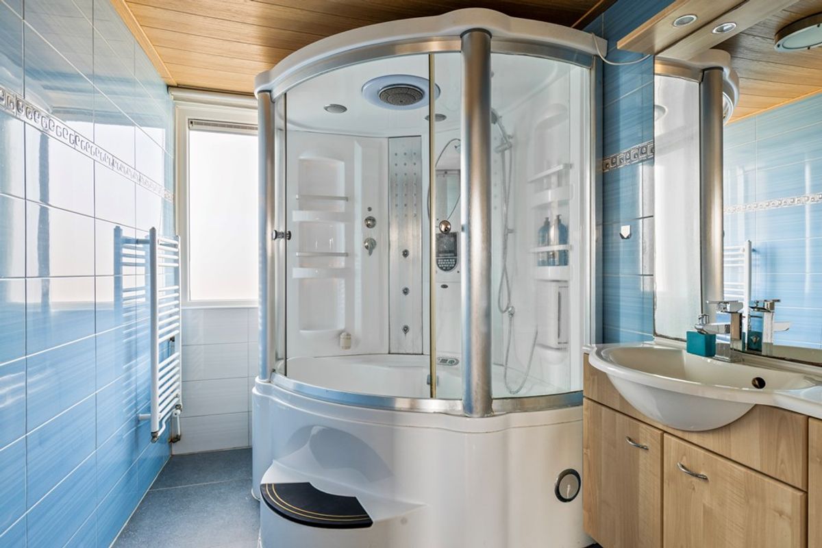 De badkamer is verhuisd naar de derde slaapkamer. Er staat een grote stoomdouche/badcabine, waarvan niet alle functies meer werken. Verder een badkamermeubel met wastafel en aan de wand een handdoekradiator. Op de vloer een donkergrijze tegel en op de wand een frisblauwe kleur, betegeld tot aan het plafond.