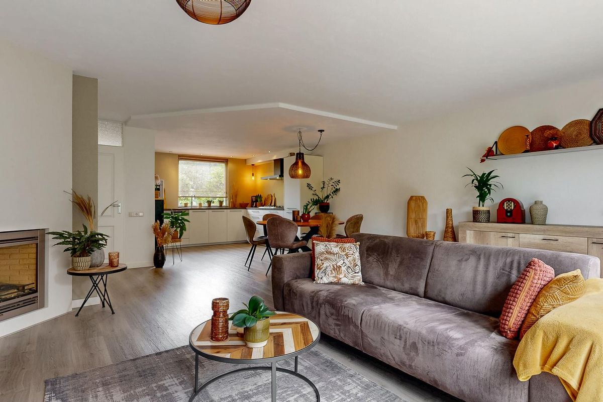Via de nette voortuin bereik je de entree met hal, garderobe, modern toilet en trapopgang. De ruime lichte woonkamer heeft een warme en uitnodigende sfeer met grote raampartijen, een mooie vloer en een gashaard die het geheel extra gezellig maakt. Er is voldoende plek voor een royale zithoek en een grote eettafel. De gehele begane grondvloer is voorzien van vloerverwarming.