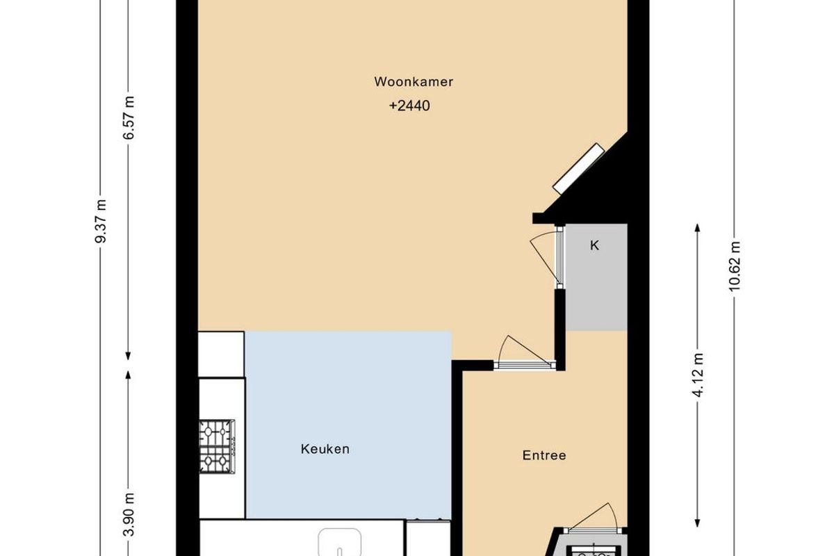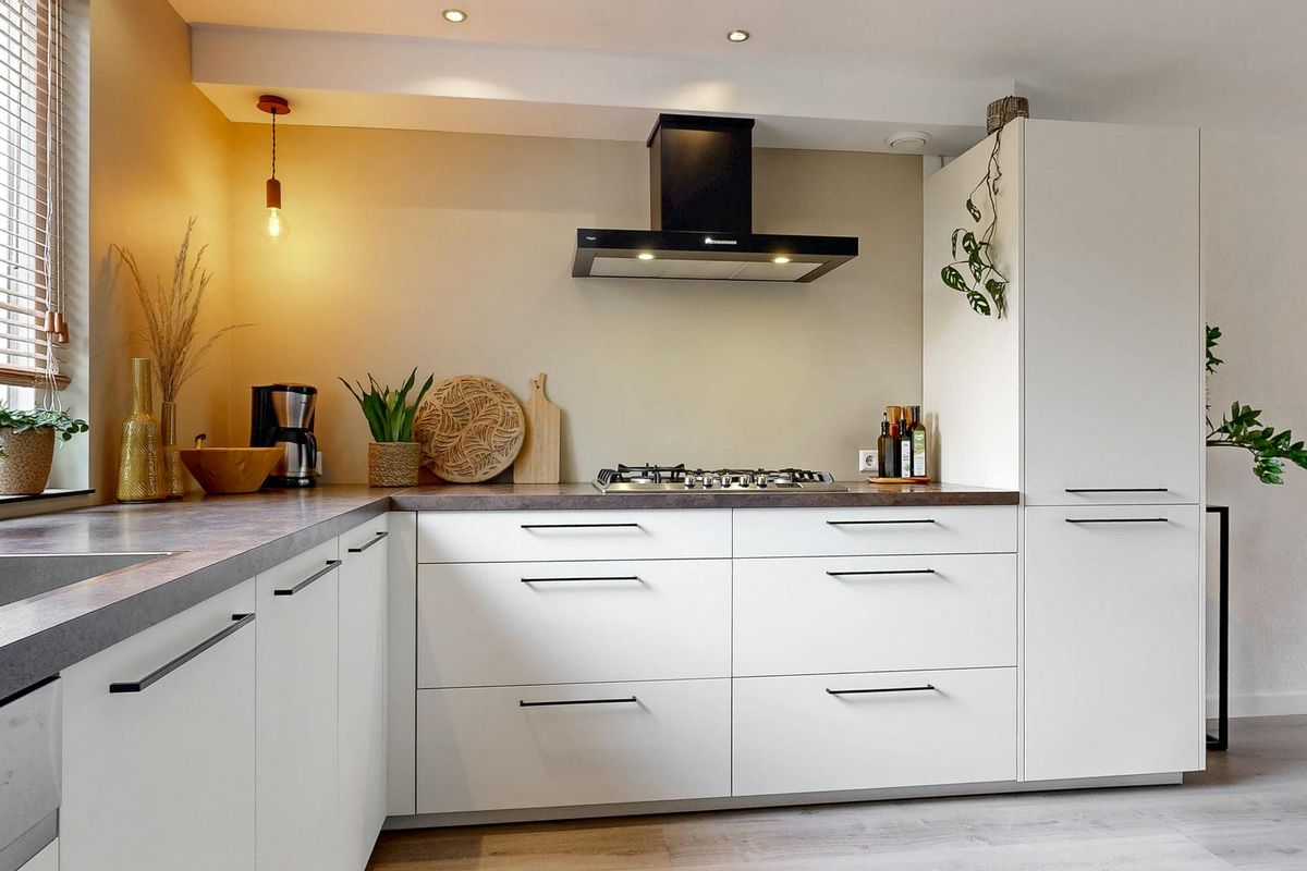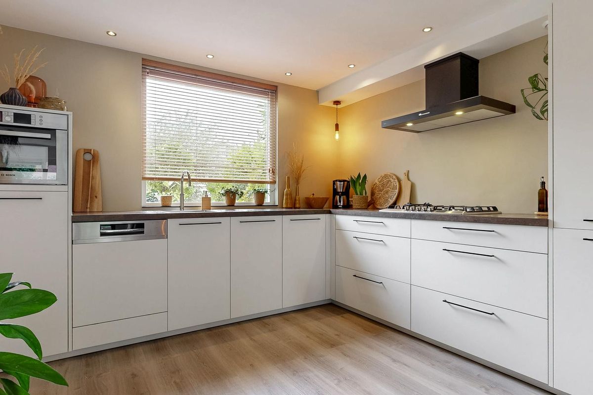 Aan de voorzijde bevindt zich de moderne open keuken in hoekopstelling, uitgevoerd in lichte tinten met donkere accenten. De keuken is uitgerust met diverse inbouwapparatuur, waaronder een 5-pits gaskookplaat, afzuigkap, combi-oven, vaatwasser, Quooker en koel-/vriescombinatie. Dankzij het ruime en extra diepe werkblad is dit een heerlijke plek voor kookliefhebbers.