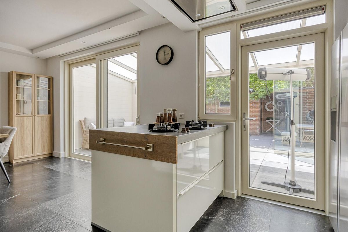 de keuken. Open keuken van 12 m² aan de achterzijde van de woning met aangenaam zicht op de tuin. De serre is over de volle breedte van de woning en van hoogwaardige materiaal.