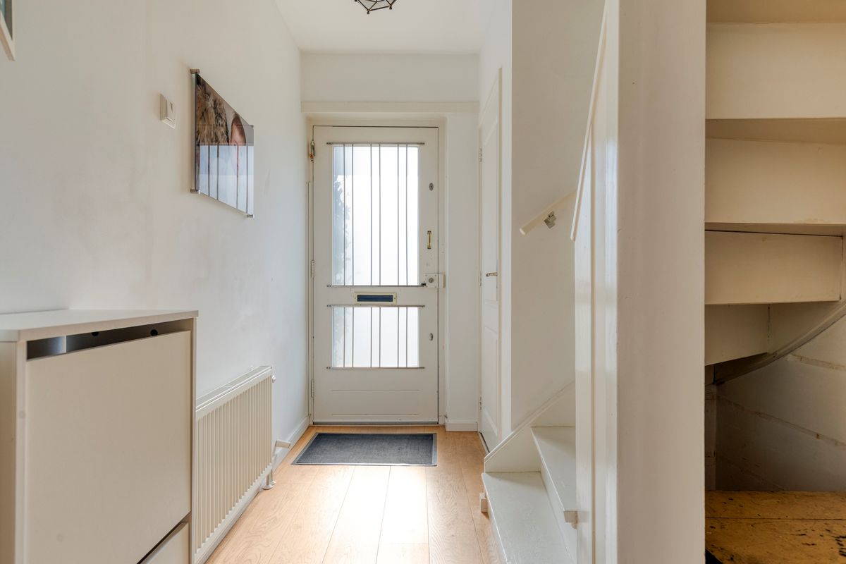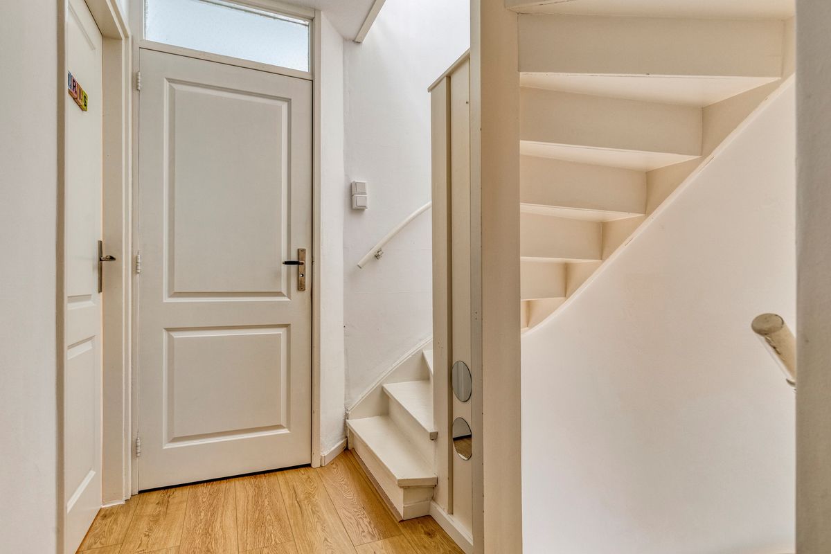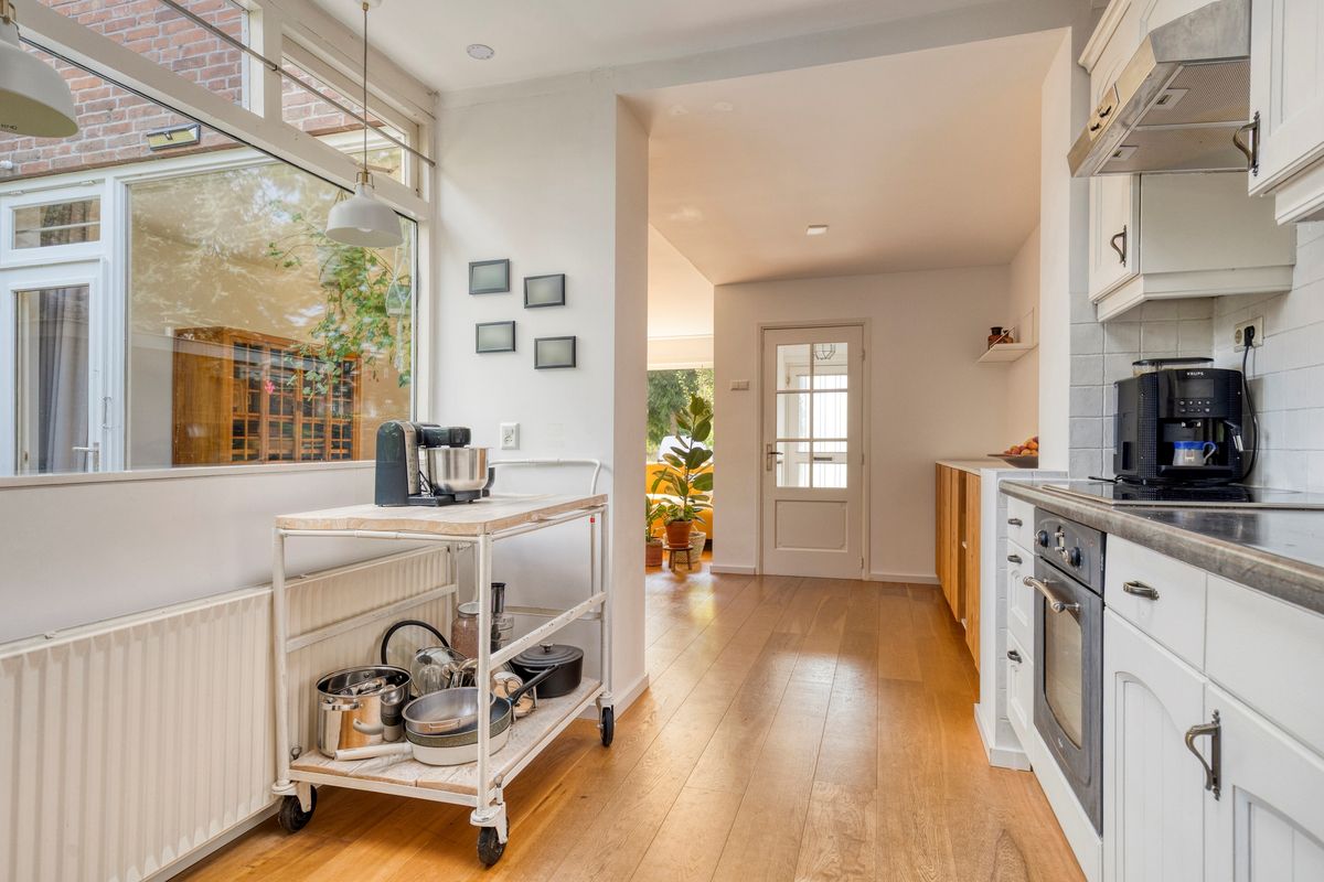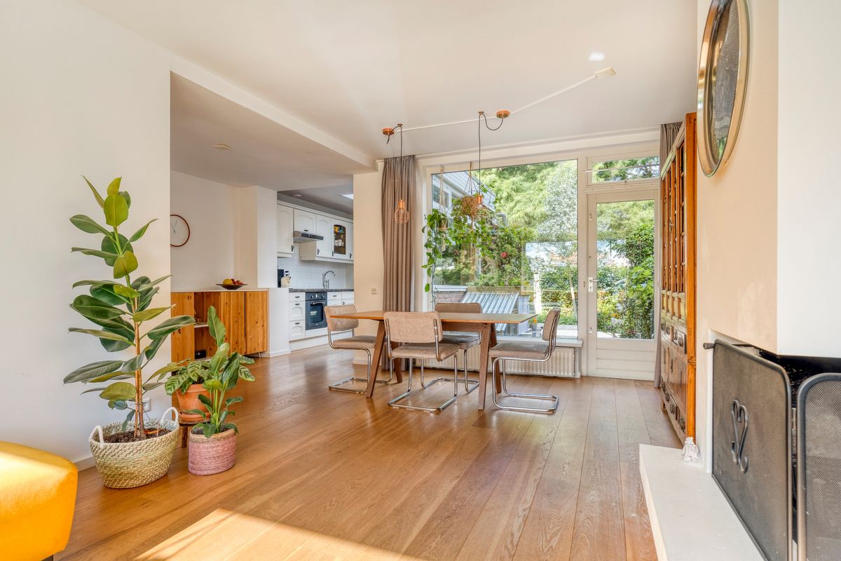 Entree, hal, toilet met fonteintje, L- vormige gezellige lichte woonkamer met open haard en geweldig uitzicht over groen en voorbij varende boten, uitbebouwde open keuken, voorzien van inbouw apparatuur, inpandige deur naar berging/ bijkeuken met de opstelplaats van de cv combi ketel en deur naar de sfeervolle achtertuin op het westen met veel privacy en een achterom voor de fiets en het speelplantsoen.