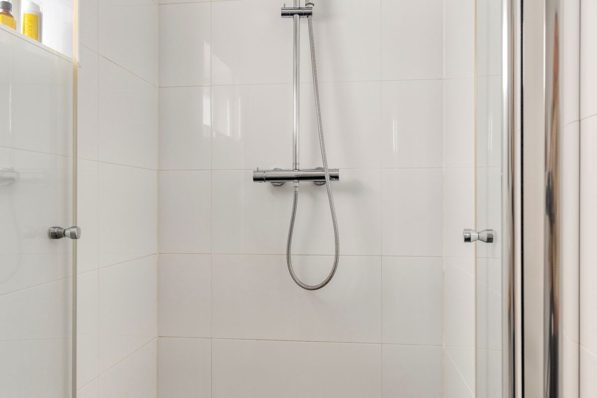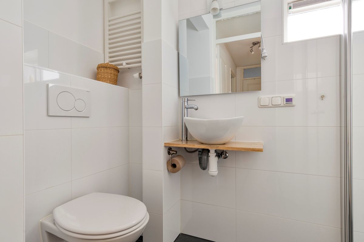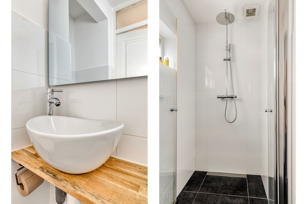 Overloop met kast, badkamer met douche, wastafel en toilet, 3 slaapkamers met leuk uitzicht, zowel voor als achter.