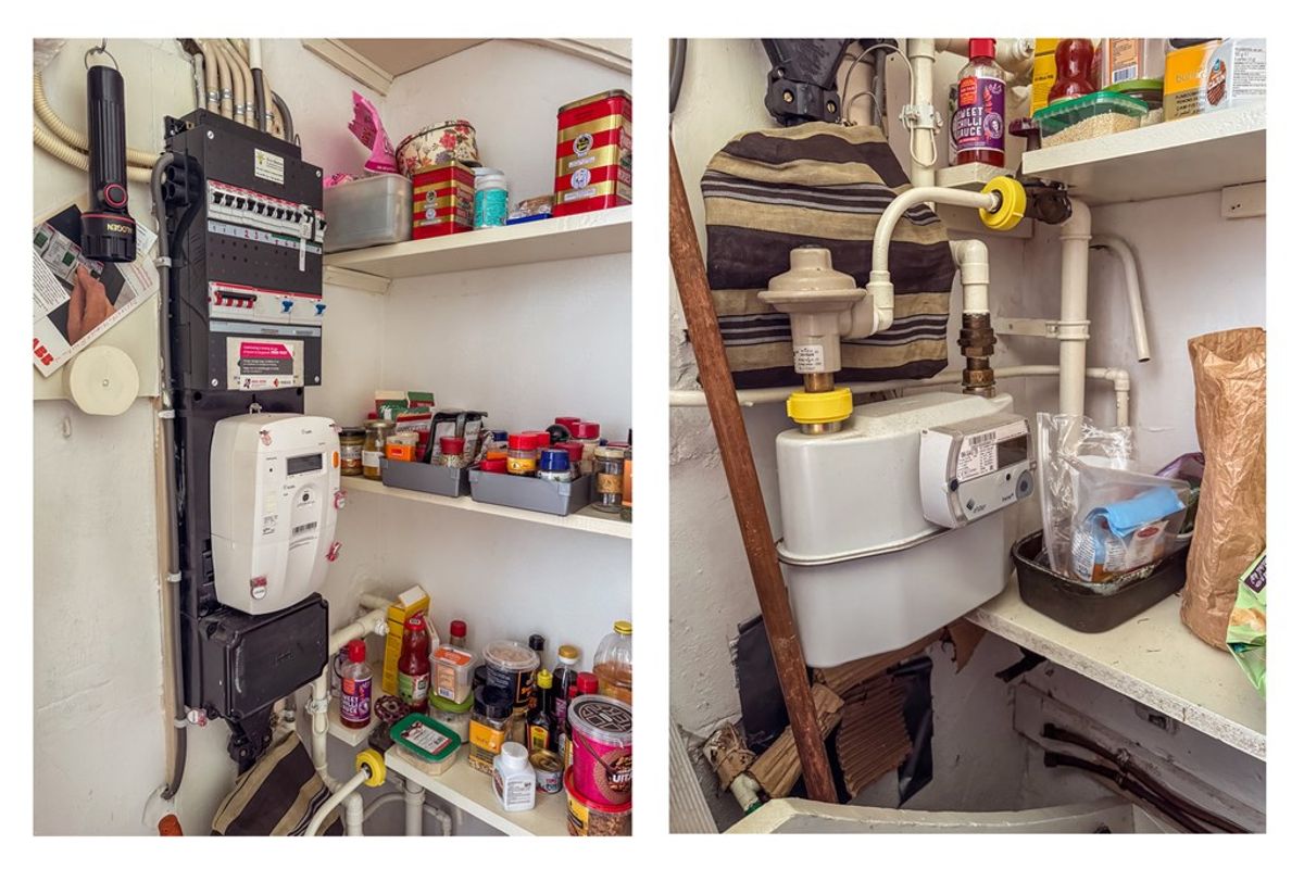 We begin our tour in the neat entrance hall, where it’s clear straight away that this home has been lovingly maintained. Here you’ll find access to the toilet, the staircase to the upper floors, and the doorway to the living room. Once in the living room, the lovely natural light immediately stands out: thanks to the large windows at both the front and rear, this space feels wonderfully light and airy. The living room is smartly finished and offers more than enough room for a cosy seating area and a generous dining area. From the living room you have access to the storage cupboard.