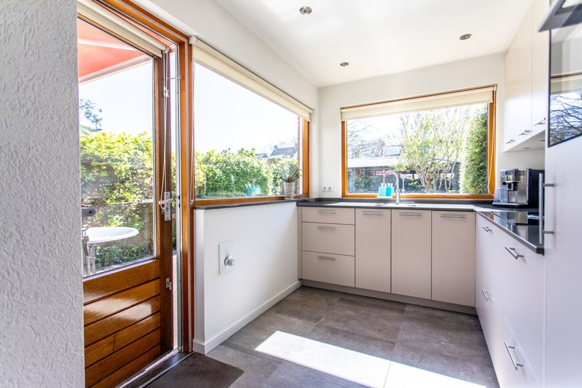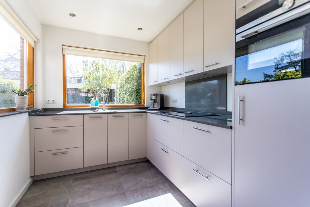 Richting de achterzijde van de woning kom je bij de halfopen keuken uit 2017, die van alle gemakken is voorzien. Denk aan diverse inbouwapparatuur, waaronder een vaatwasser (wordt geplaatst), een Quooker, een inductiekookplaat, combi-oven en een koelkast. Daarnaast beschikt de keuken ook over vloerverwarming. De keuken is stijlvol afgewerkt en ideaal gepositioneerd, met uitzicht op de tuin. Via de openslaande deur wandel je zó de zonnige achtertuin in.