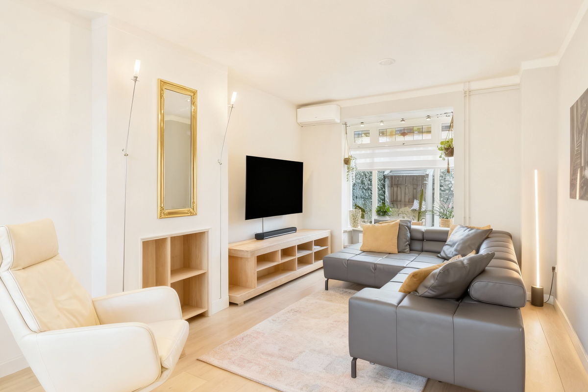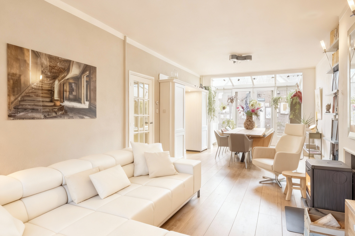 De hoofdwoning heeft een lichte woonkamer met een authentieke erker en glas-in-loodramen. Aan de achterzijde is de woning uitgebouwd met een glazen dak en houten kozijnen, wat zorgt voor veel licht en een natuurlijke verbinding met de tuin. De woonkamer is voorzien van een houtkachel en airconditioning. De moderne keuken is strak afgewerkt en uitgerust met inbouwapparatuur.