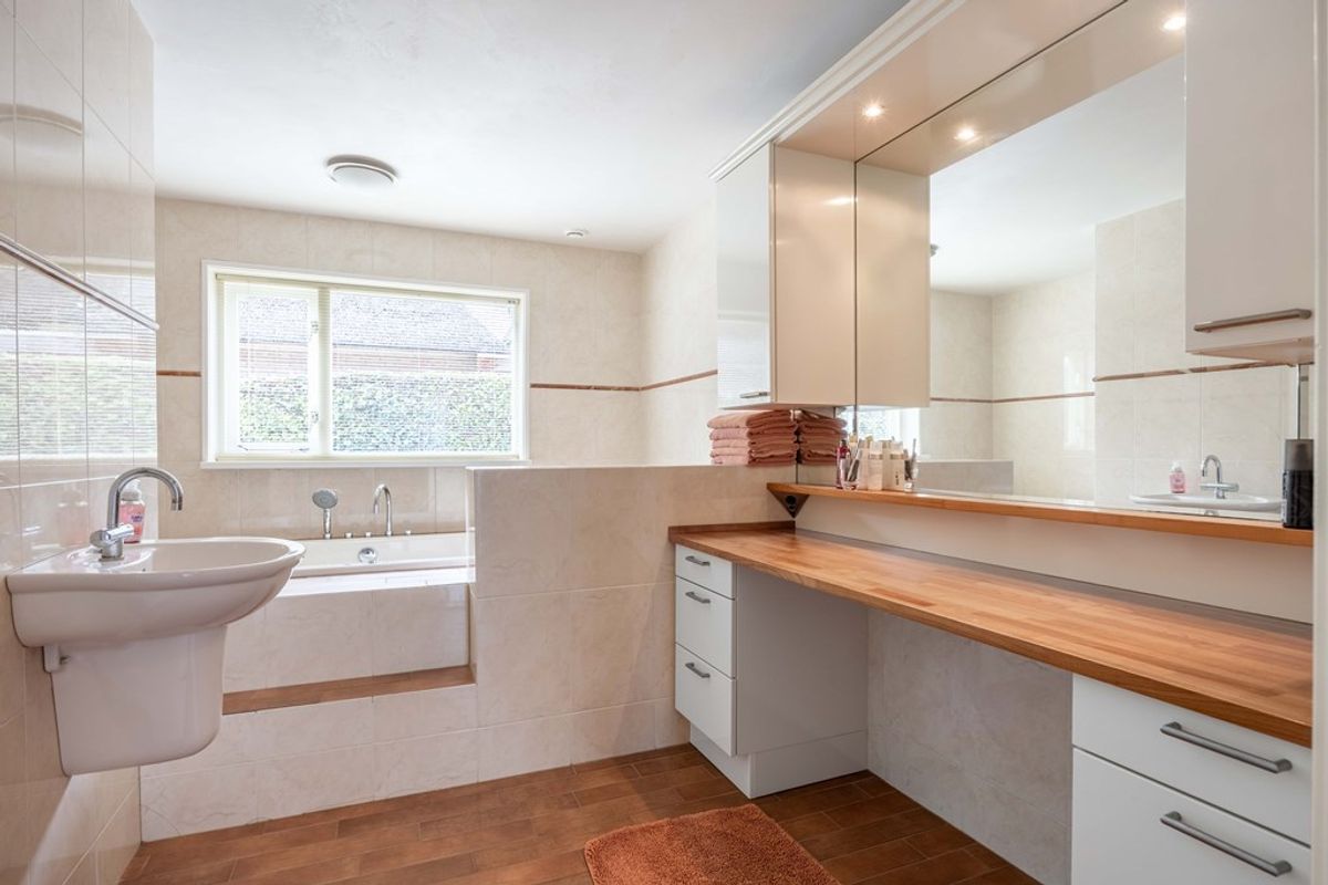 De royale, tuingerichte woonkamer met dubbele tuindeuren en aangebouwde serre zorgt voor veel licht en een fijne verbinding met de tuin. Daarnaast beschikt de woning over een tweede woonkamer van circa 27 m² met een sfeervolle open haard.