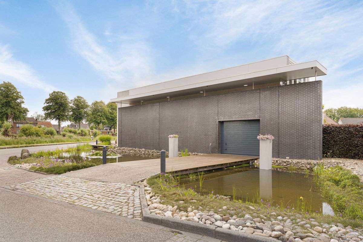 De voorzijde van het huis is omgeven door een vijverpartij met diverse waterplanten en vissen. Een loopbrug met houten vlonders geeft toegang tot de voordeur.