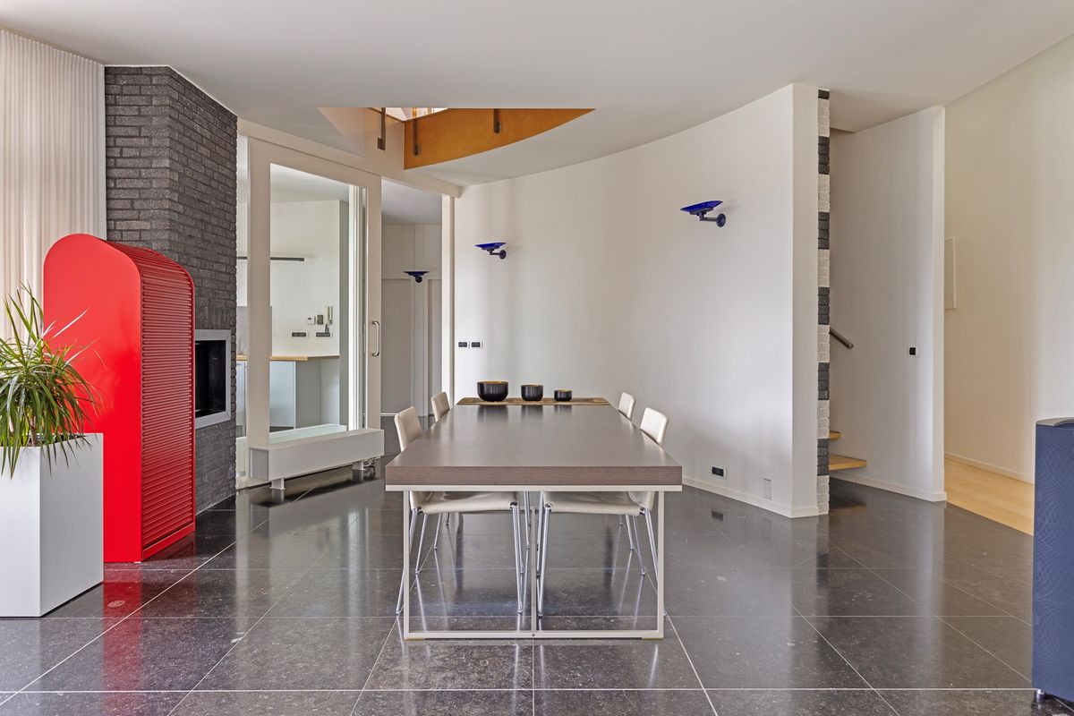 Een bijzondere plek om te wonen, waar zowel de binnen- als de buitenruimtes strak en rustig zijn gehouden waardoor de bijzondere architectuur met het thema “Licht – Ruimte – Structuur” volledig tot zijn recht komt.