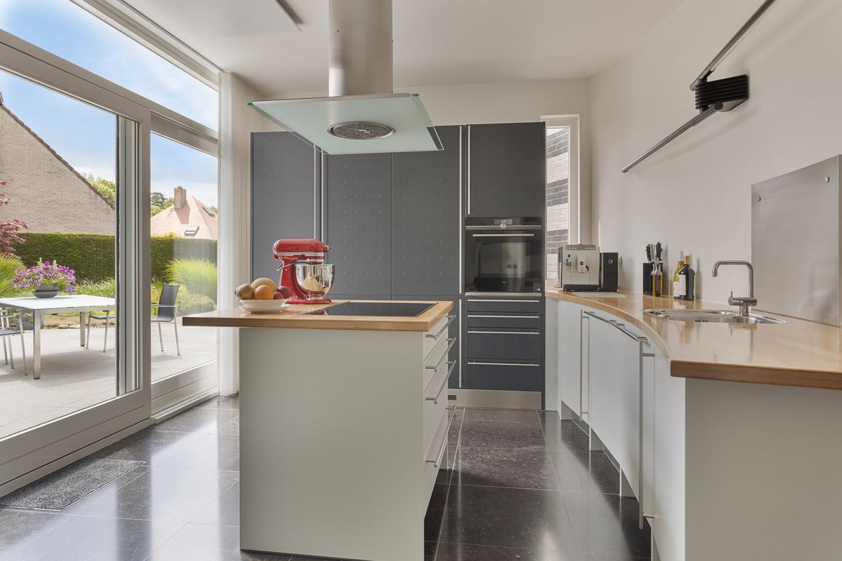 De ronding van de woonkamer met de keuken loopt door naar het terras, wat bereikbaar is via de diverse schuifpuien van zowel de woonkamer als de keuken.