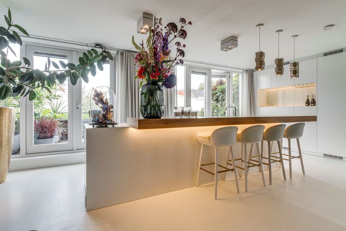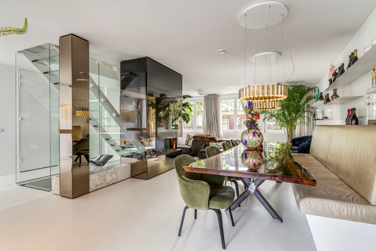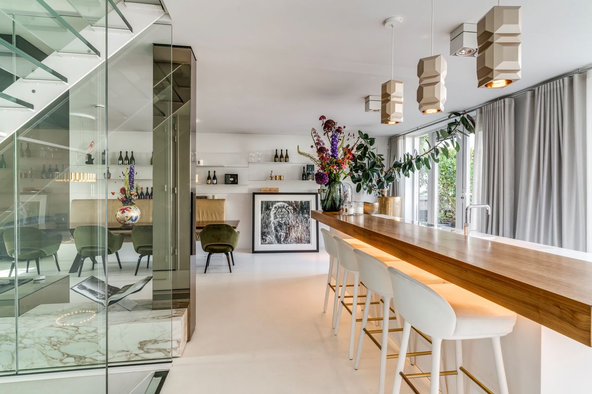Op de eerste verdieping bent u op de woonetage aangekomen. De keuken met bar staat centraal, hier bevinden zich openslaande deuren naar het zonnige terras. De keuken is voorzien van alle gemakken: inductie kookplaat met ingebouwde afzuigkap, quooker, stoomoven, combi-oven, koelkast en vriezer etc. In het eetgedeelte bevindt zich de open haard welke voor extra sfeer en warmte zorgt op deze etage. Aan de voorzijde treft u de royale zitkamer.