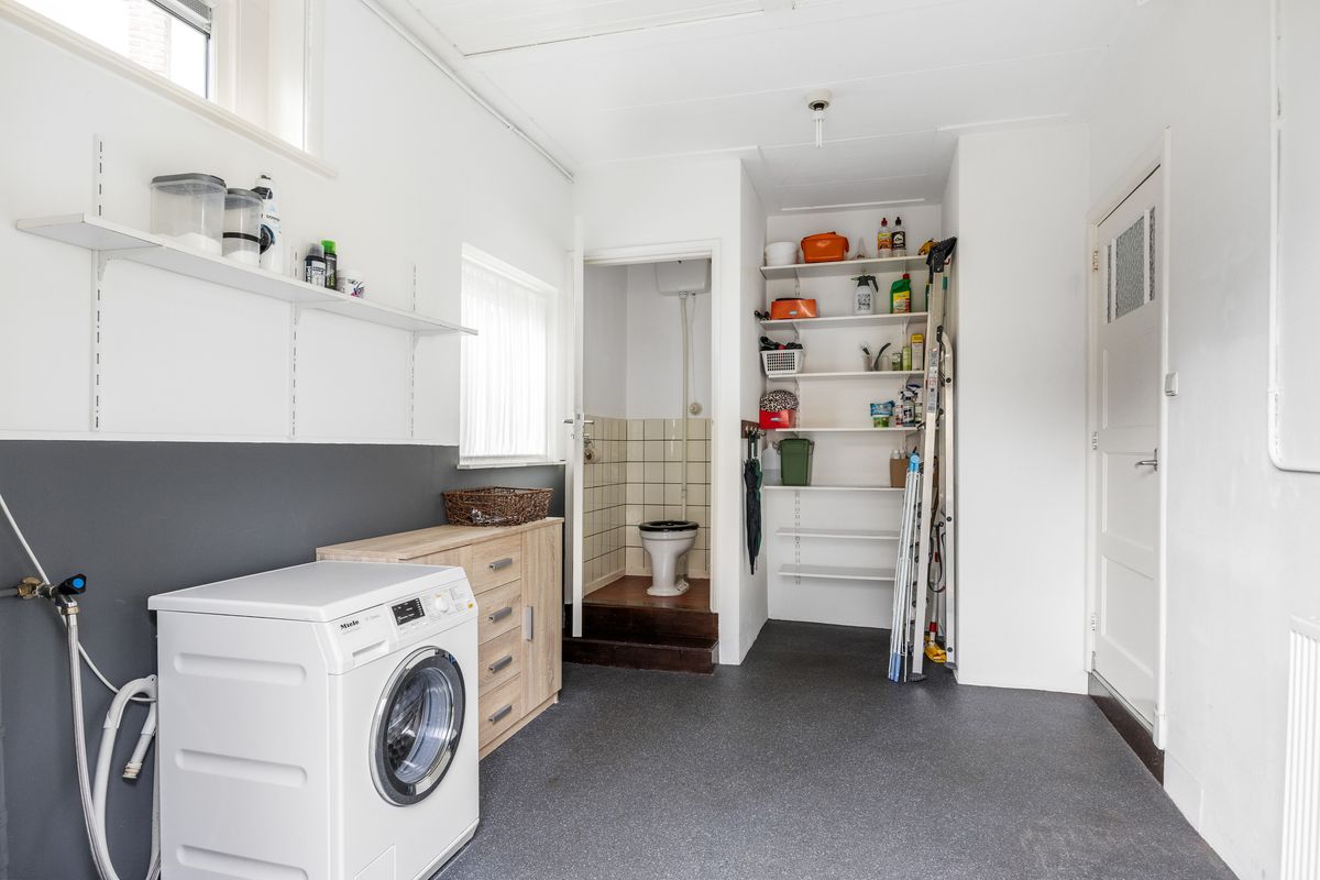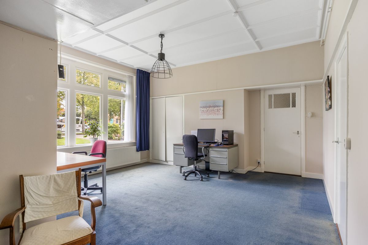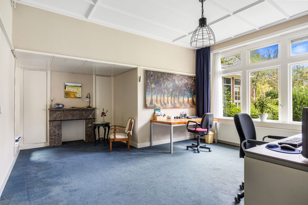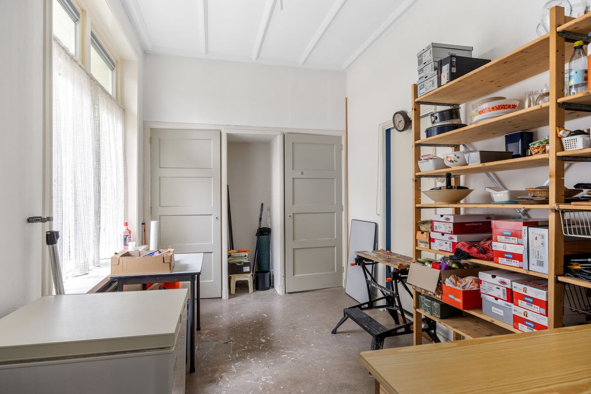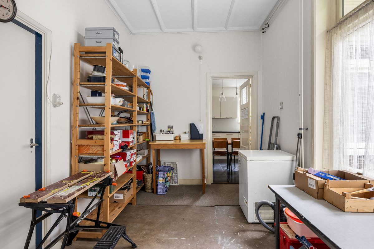 Entree, klassieke hal met schoonmetselwerk en "oude tegeltjes", meterkast, toilet en de trapopgang. De woonkamer met schouw heeft veel lichtinval door de grote ramen aan de voor- en achterzijde. Aan de andere kant van de ruime hal aan de voorzijde van de woning bevindt zich tevens een royale werkkamer of eventueel slaapkamer met inbouwkasten. Deze ruimte is ook in te richten als kantoor/praktijkruimte. De ruime woonkeuken is centraal in de woning gelegen met een keuken in hoekopstelling, voorzien van diverse inbouwapparatuur. Vanuit de keuken is er toegang tot de bijkeuken/werkkamer, de grote kelder en de wasruimte. In de wasruimte bevinden zich de aansluitingen voor het witgoed en hier is ook een 2e toilet aanwezig. Middels een vlizotrap is er toegang naar de bergzolder. De bijkeuken/werkkamer met praktische afmetingen is voorzien van een kastenwand. De ruime kelder met natuurlijke lichtinval en ventilatie biedt voldoende ruimte voor diverse hobby's of opslag.