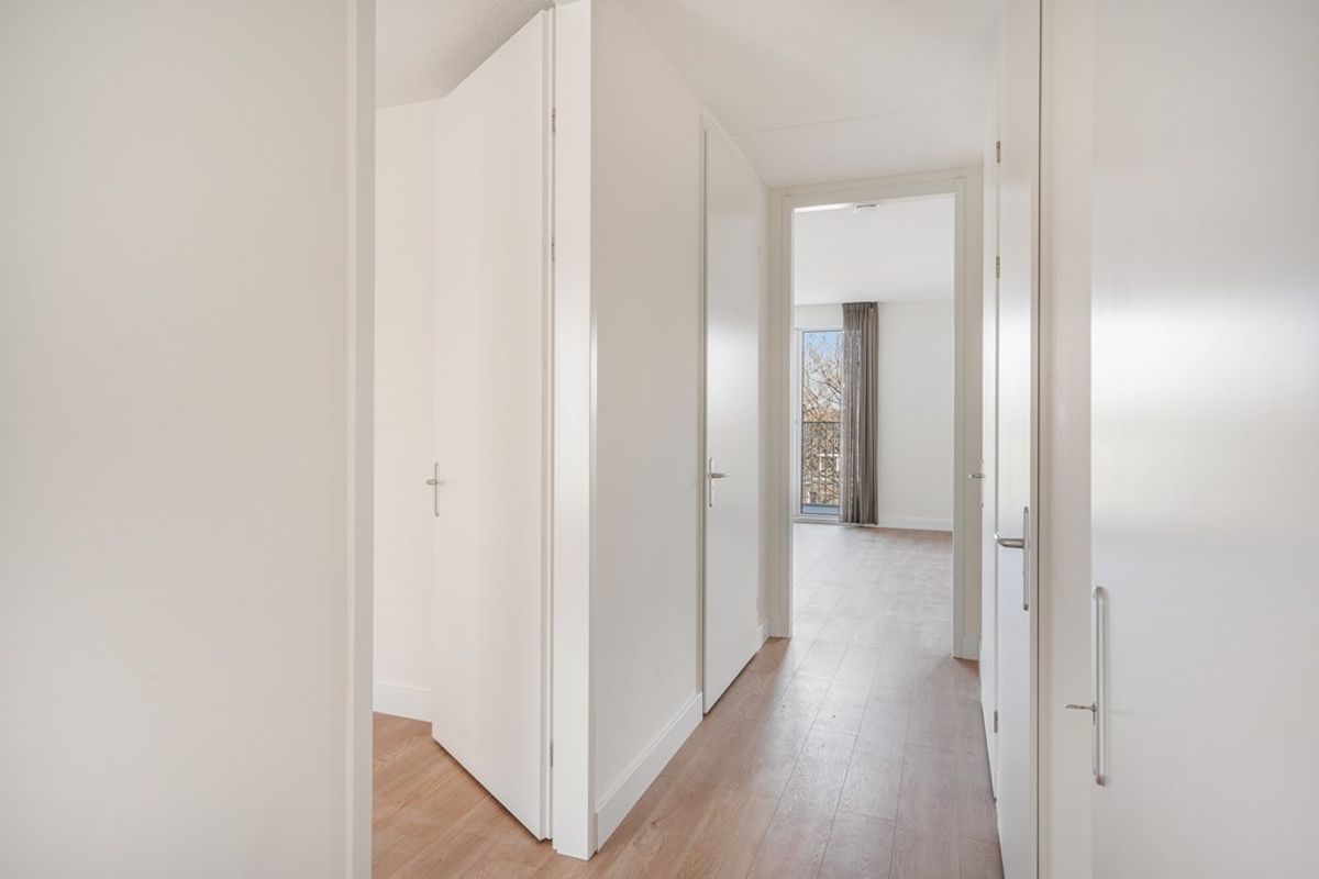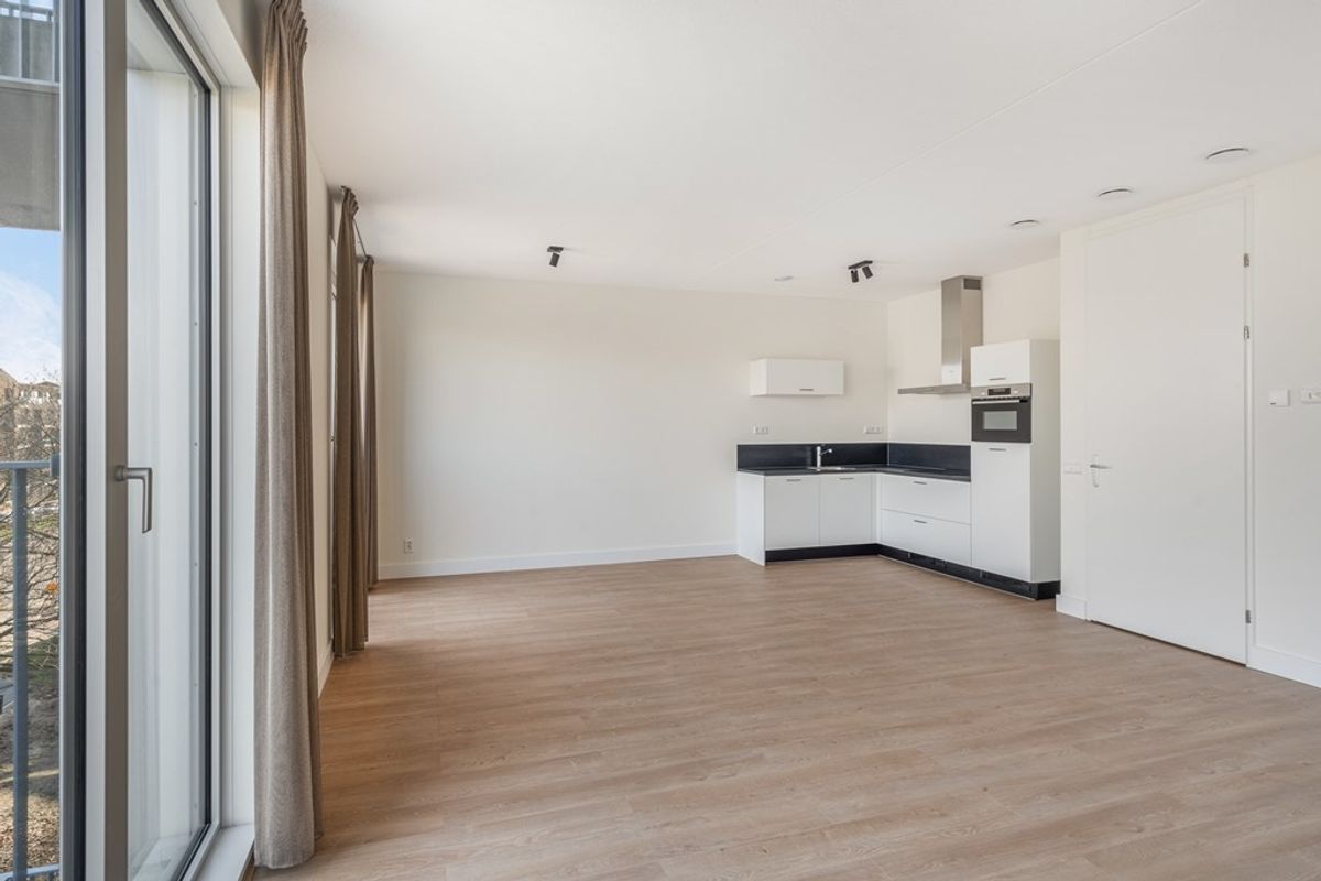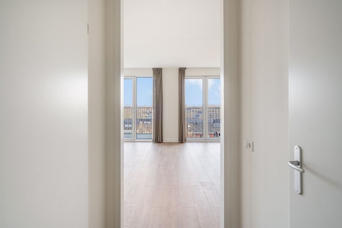 Gemeenschappelijke entree, lift/trappenhuis naar vijfde verdieping. Entree appartement, hal, slaapkamer, separaat toilet, technische ruimte met aansluiting voor wasmachine en droger, hoogwaardig afgewerkte badkamer met inloop (regen)douche, ruime woonkamer met veel natuurlijke lichtinval door de hoge raampartijen welke tevens toegang biedt tot het balkon, luxe keuken voorzien van onder andere inductiekookplaat met afzuiging, koelkast met vriesvak, combi oven/magnetron en vaatwasser. De woning is volledig voorzien van vloerverwarming -en koeling.