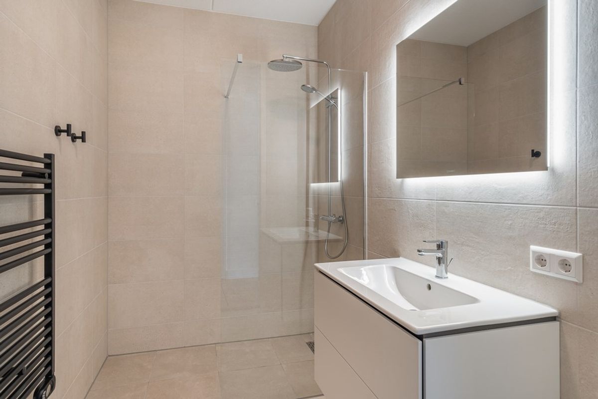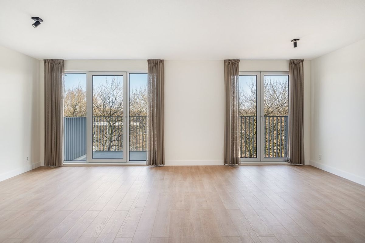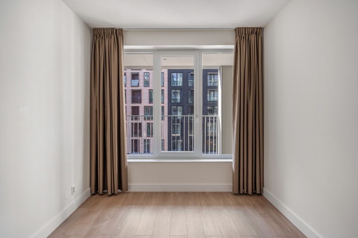 Communal entrance, elevator/staircase to third floor. Entrance apartment, bedroom, separate toilet, utility room with connection for washing machine and dryer, high quality finished bathroom with walk-in (rain) shower, spacious living room with natural light through the high windows which also provides access to the balcony, luxury kitchen with induction hob with extractor fan, fridge with freezer, combi oven / microwave and dishwasher. The apartment is fully equipped with floor heating and cooling.