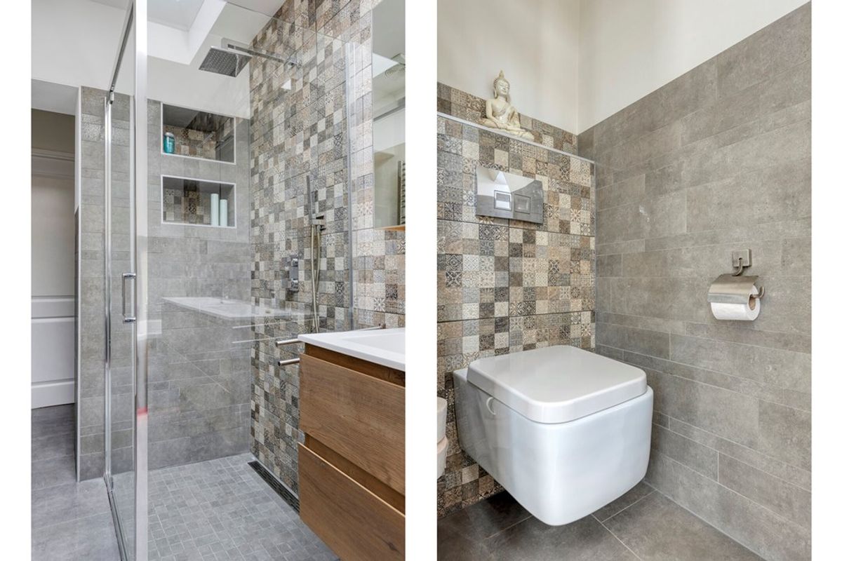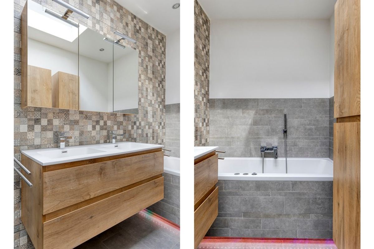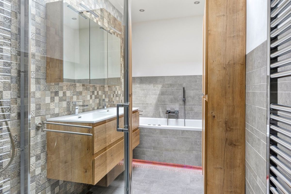 Moderne badkamer (ca. 2020) voorzien van ligbad, inloopdouche, wastafelmeubel en toilet. Door de lichtkoepel is dit een heerlijk lichte ruimte.