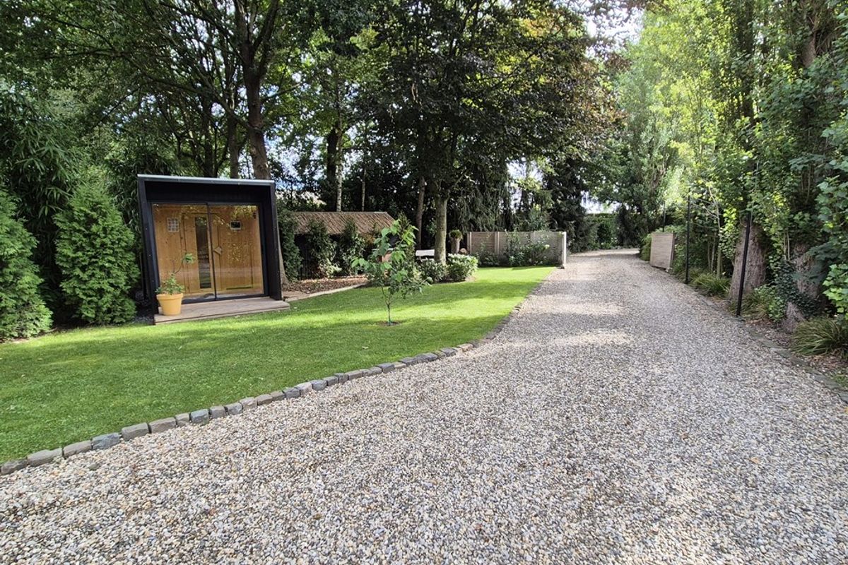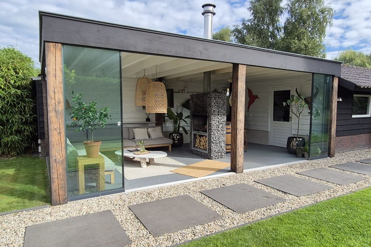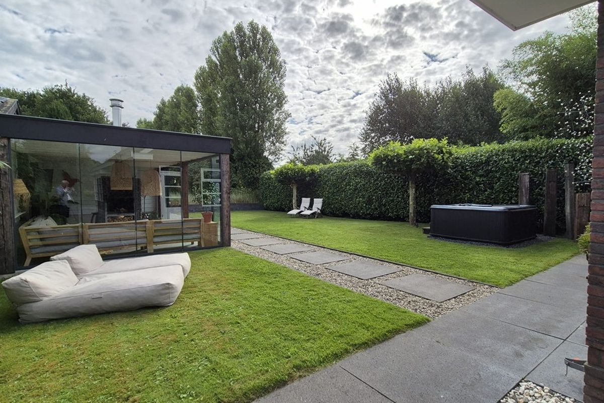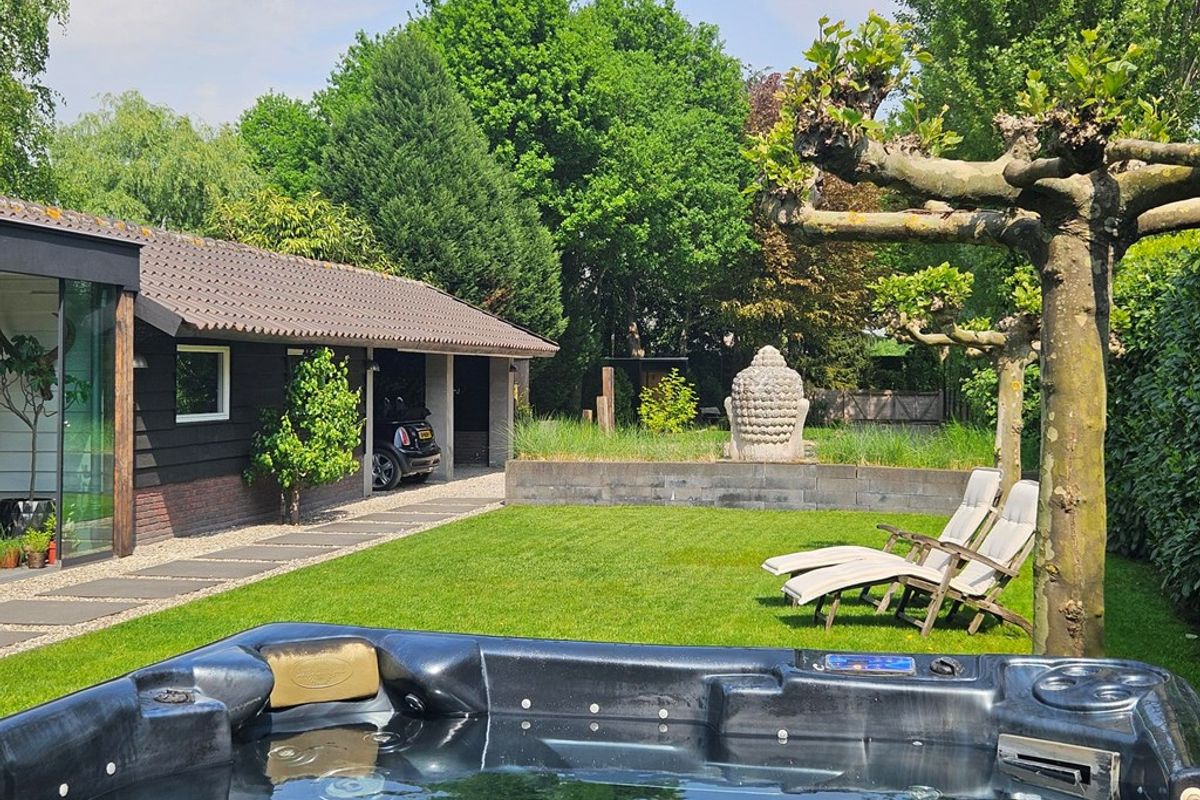 De tuin is een waar paradijs: kleurrijke borders, een strak gazon, hoge bomen en sfeervolle hoekjes. Tevens bevindt zich hier een moderne zwarte sauna, strak vormgegeven met veel hout en glas – perfect voor ontspanning. Centraal in de tuin staat een veranda met glazen wanden, een buitenhaard, barbecuehoek, zitgedeelte én televisieaansluiting: hier kunt u het hele jaar door genieten. Aansluitend vindt u een royale berging met houtopslag.