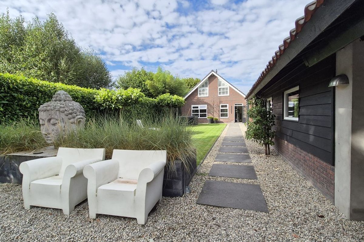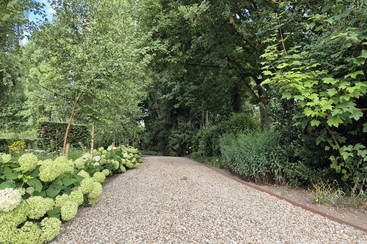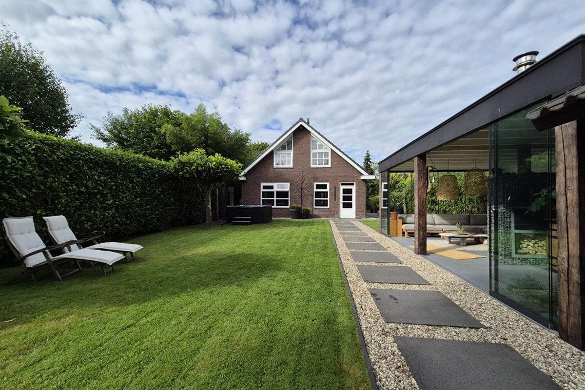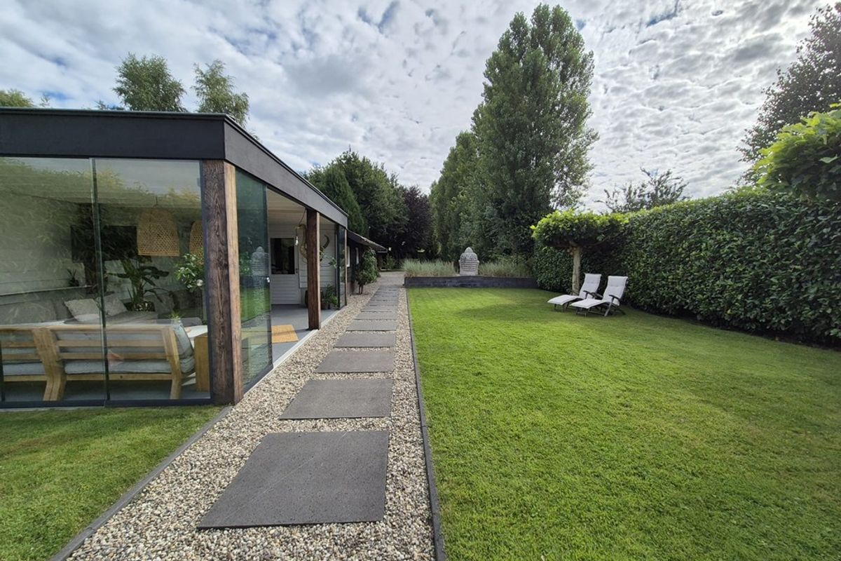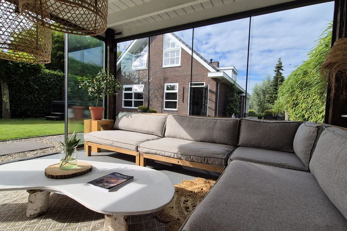 De tuin is een waar paradijs: kleurrijke borders, een strak gazon, hoge bomen en sfeervolle hoekjes. Tevens bevindt zich hier een moderne zwarte sauna, strak vormgegeven met veel hout en glas – perfect voor ontspanning. Centraal in de tuin staat een veranda met glazen wanden, een buitenhaard, barbecuehoek, zitgedeelte én televisieaansluiting: hier kunt u het hele jaar door genieten. Aansluitend vindt u een royale berging met houtopslag.