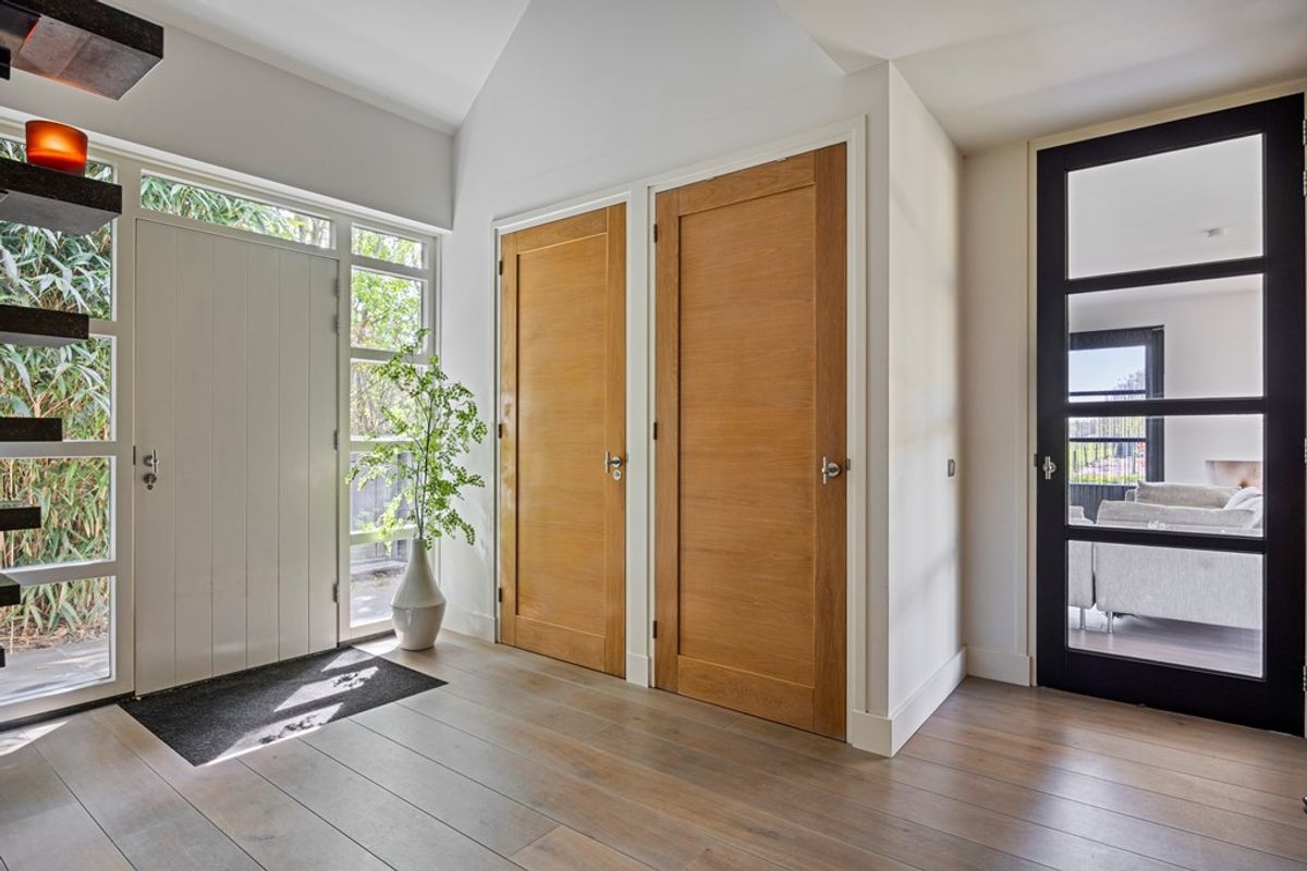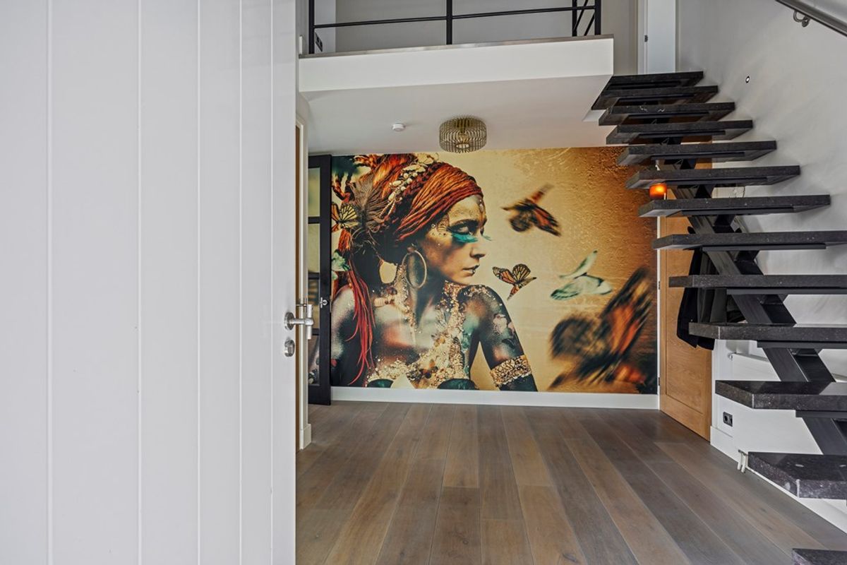 Wat een fijne binnenkomst! U wordt verwelkomd in een royale, lichte hal die strak is afgewerkt. Hier vindt u een mooie stalen trap met natuursteen naar boven, ruimte voor een garderobe en toegang tot het moderne toilet en de luxueuze badkamer. Vanuit de hal loopt u door naar de woonkamer, waar het uitzicht direct uw aandacht trekt. Grote raampartijen en openslaande tuindeuren zorgen voor een zee aan licht en een prachtig groen panorama. De zithoek is ruim opgezet, met een gezellige haard als blikvanger.