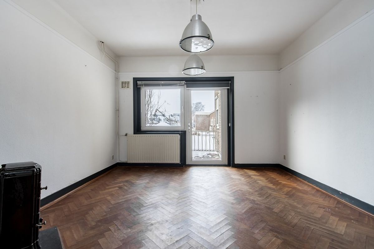 Woonkamer is voorzien van een houten vloer en aan de achterzijde een ruim balkon.