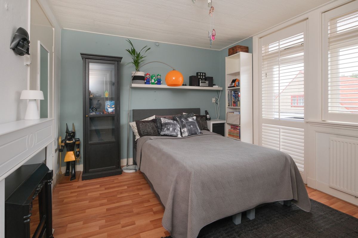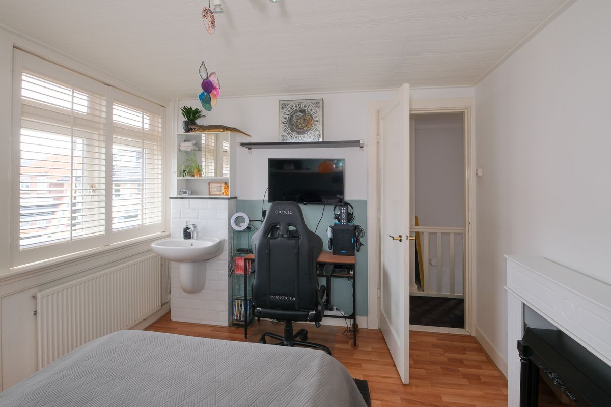 Drie kamers op deze verdieping, elk met hun eigen karakter. De hoofdslaapkamer is royaal en heeft een ingebouwde kast. De kleinste kamer aan de achterzijde is ingericht als werkkamer (inclusief een grote kast), via deze kamer heb je toegang tot een sfeervol afgewerkt dakterras – met sierhekwerk, groen uitzicht en een heel eigen sfeer. Een plek waar je even buiten zit zonder van huis te gaan.