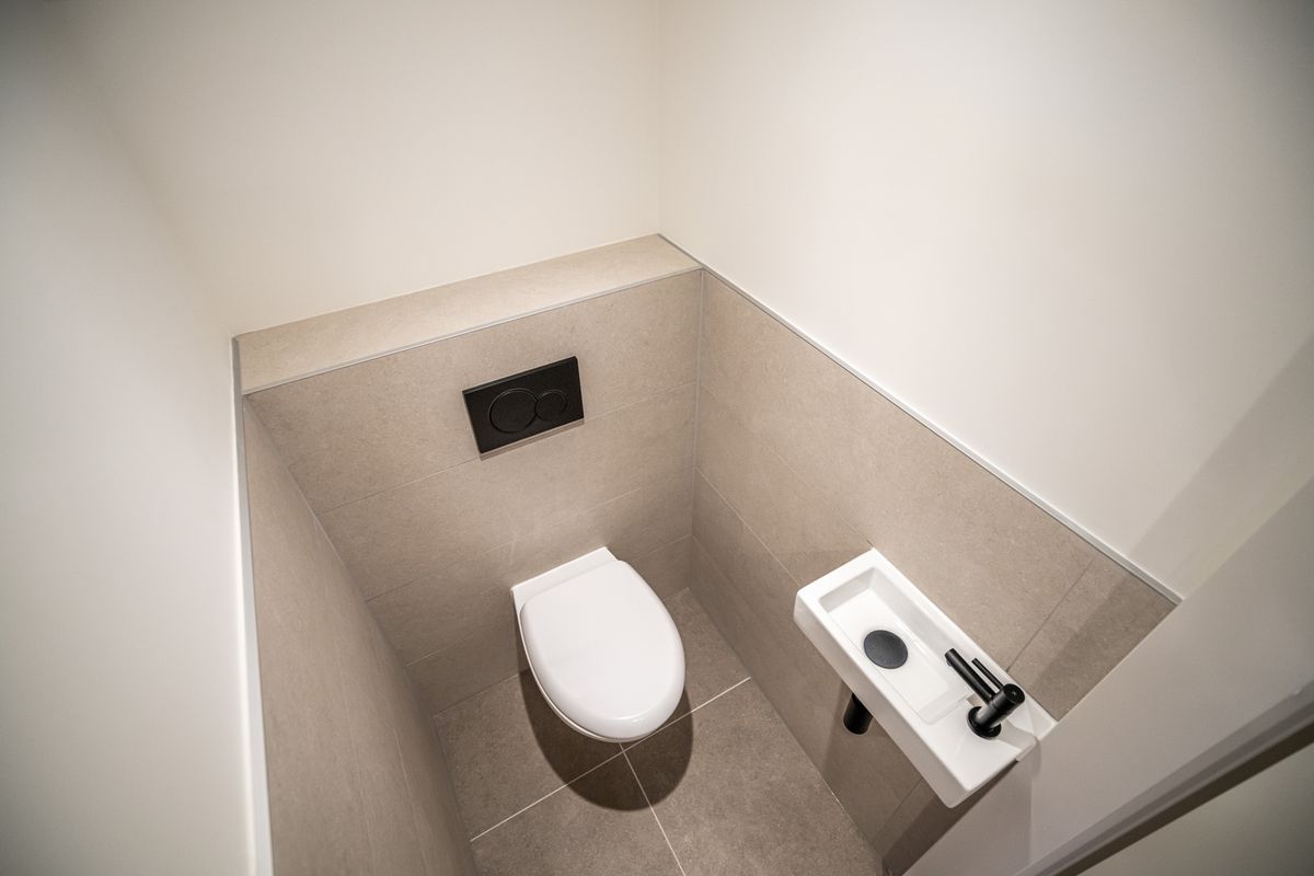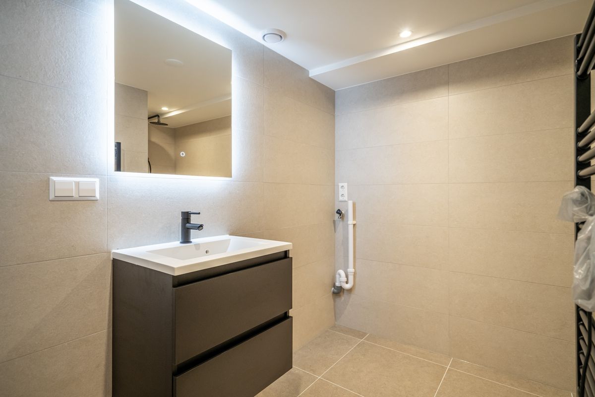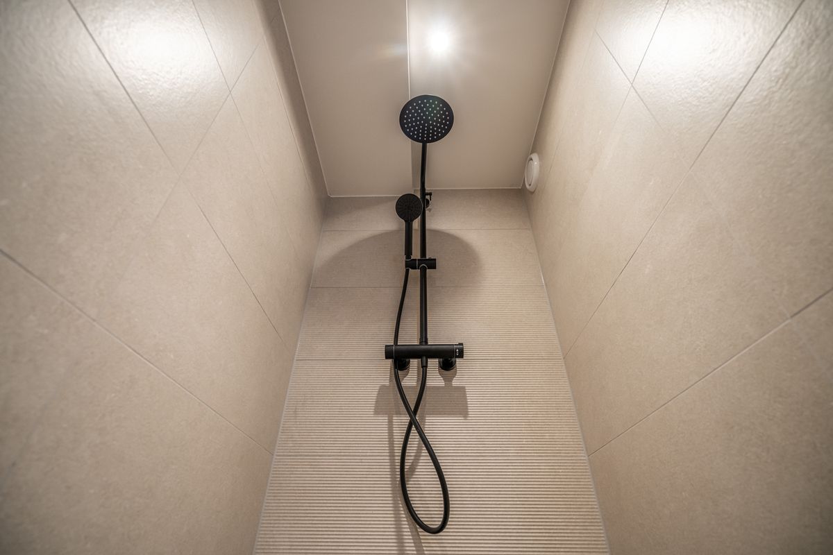 - Een volledig betegelde badkamer met inloopdouche en wastafelmeubel.