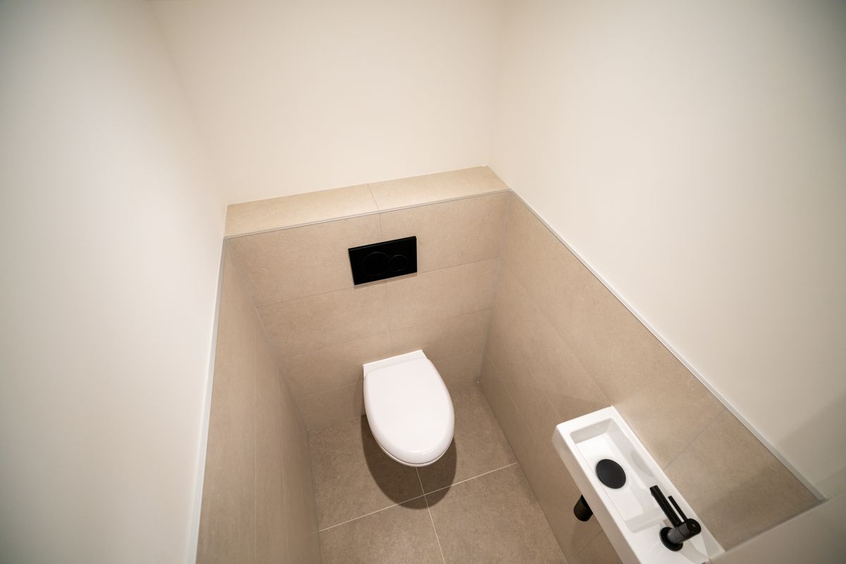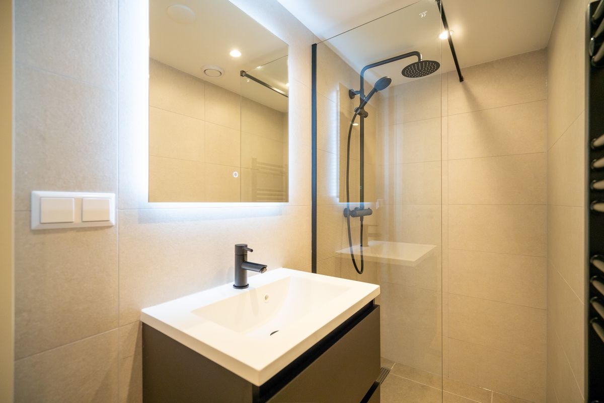 - Een volledig betegelde badkamer met inloopdouche en wastafelmeubel.