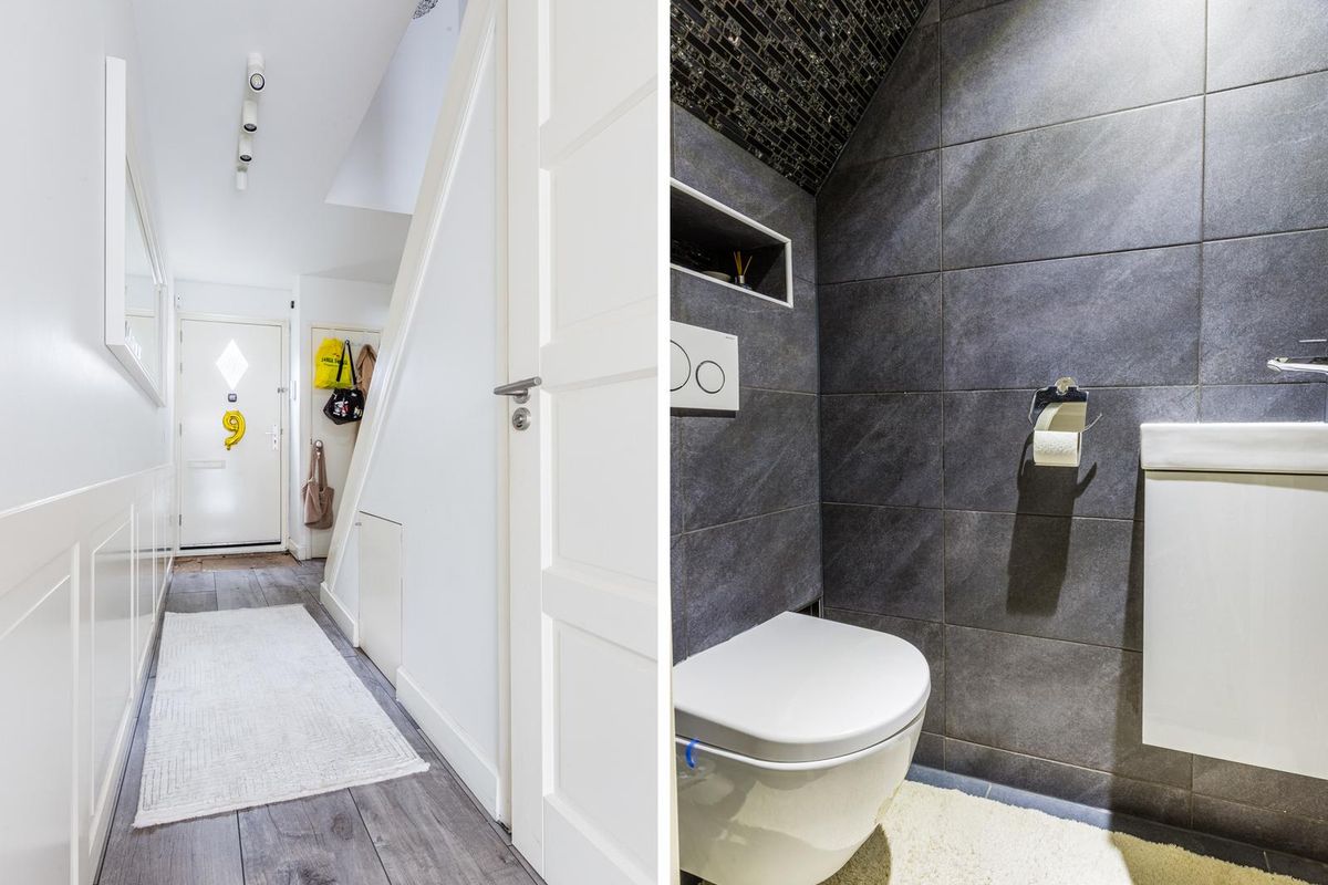 Via de fraai aangelegde voortuin bereik je de (fietsen)berging en voordeur van deze charmante woning. Na binnenkomst word je verwelkomd in een ruime, keurig afgewerkte entreehal met meterkast, trap naar de eerste verdieping, een luxe toiletruimte met zwevend toilet en fonteintje, en toegang tot de woonkamer.